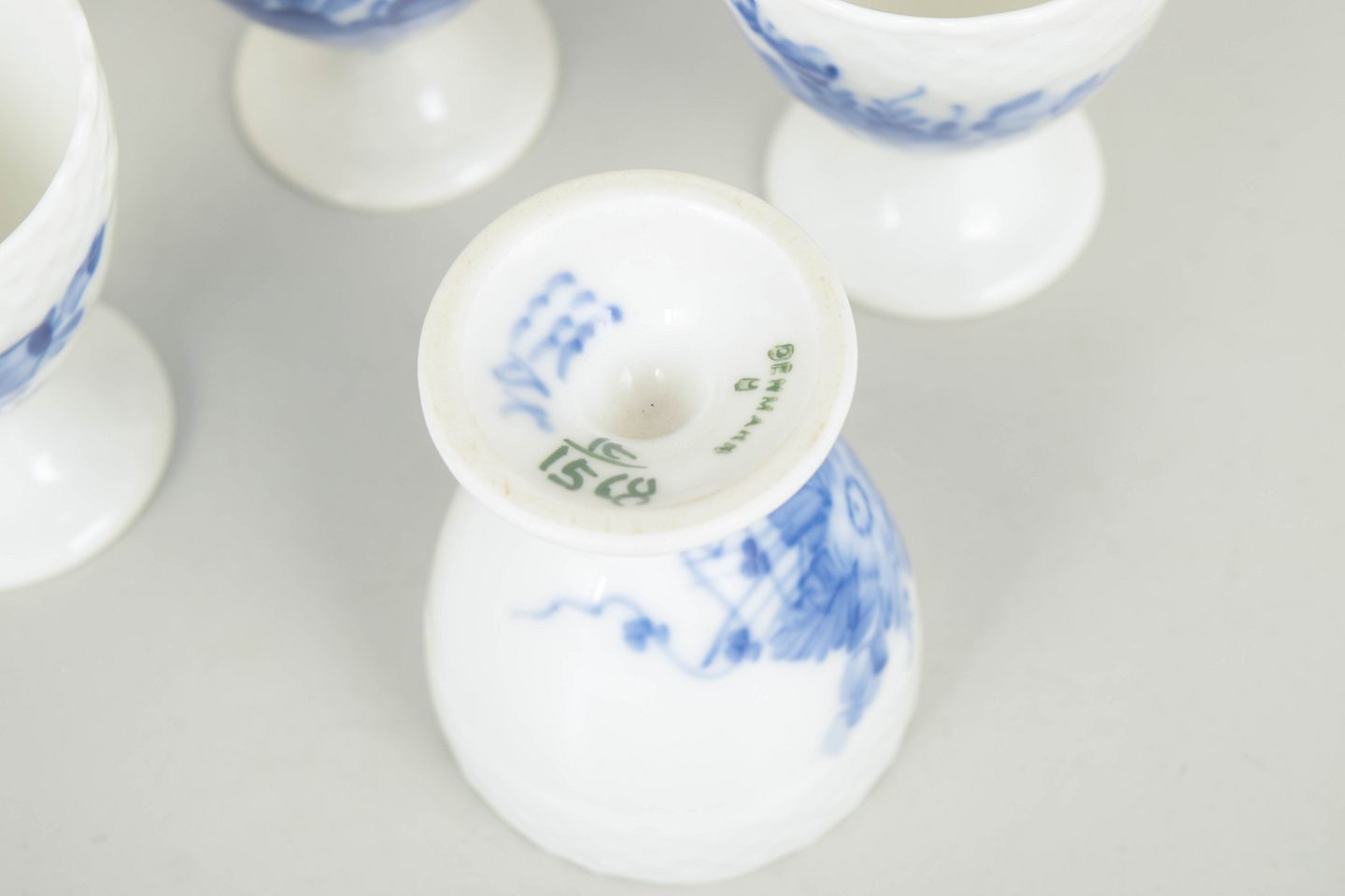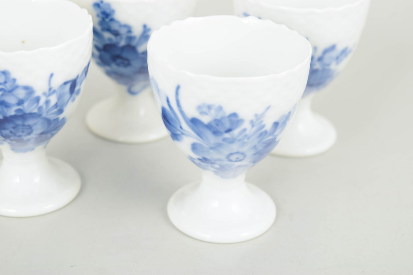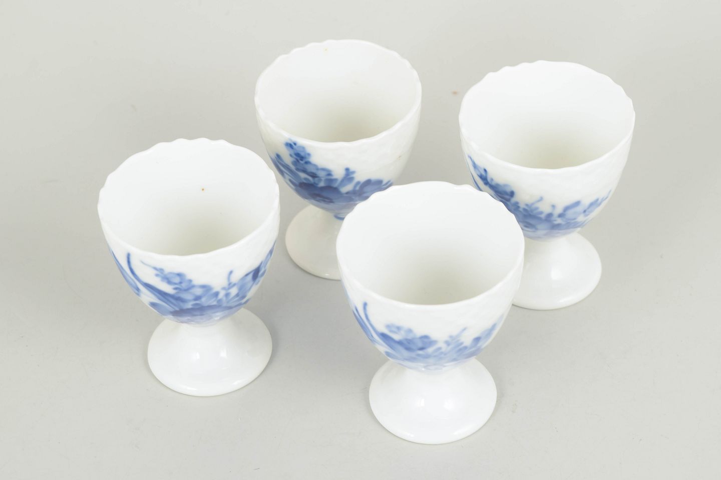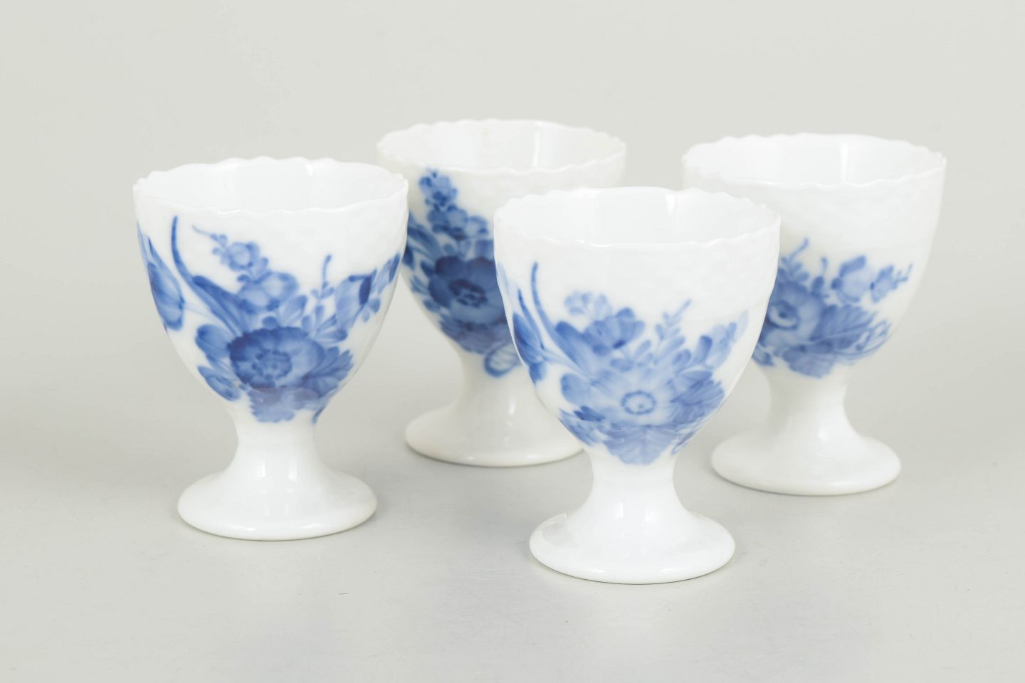 Sæt bestående af fire æggebægre i porcelæn med håndmalet blå blomsterdekoration i relief. Modelnummer 10/1568, 1. sortering, fra tidligt 1900-tal.