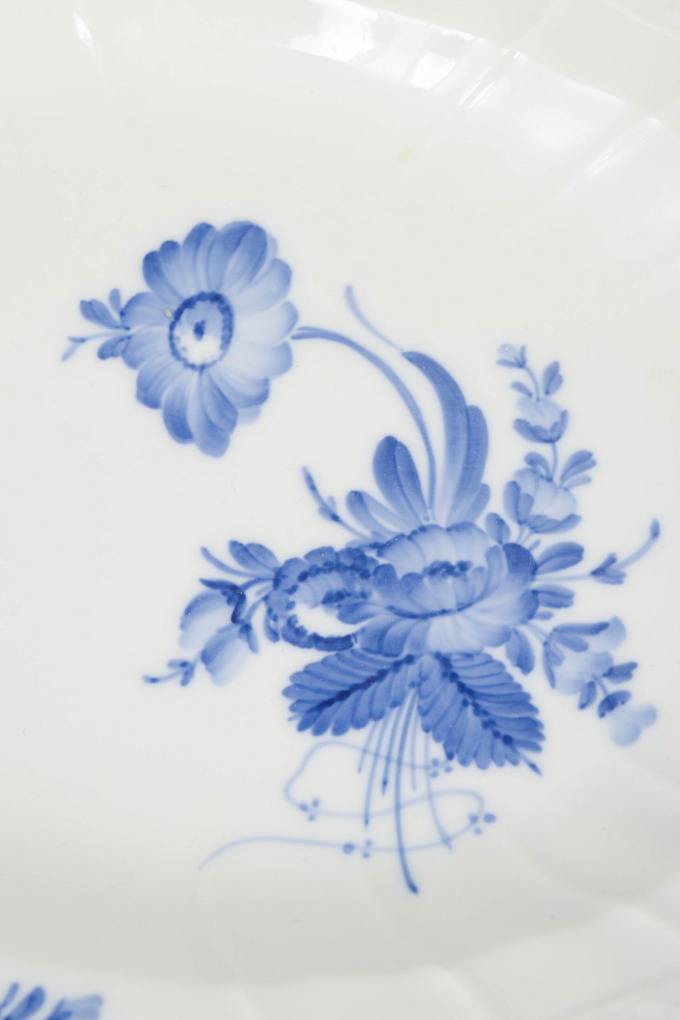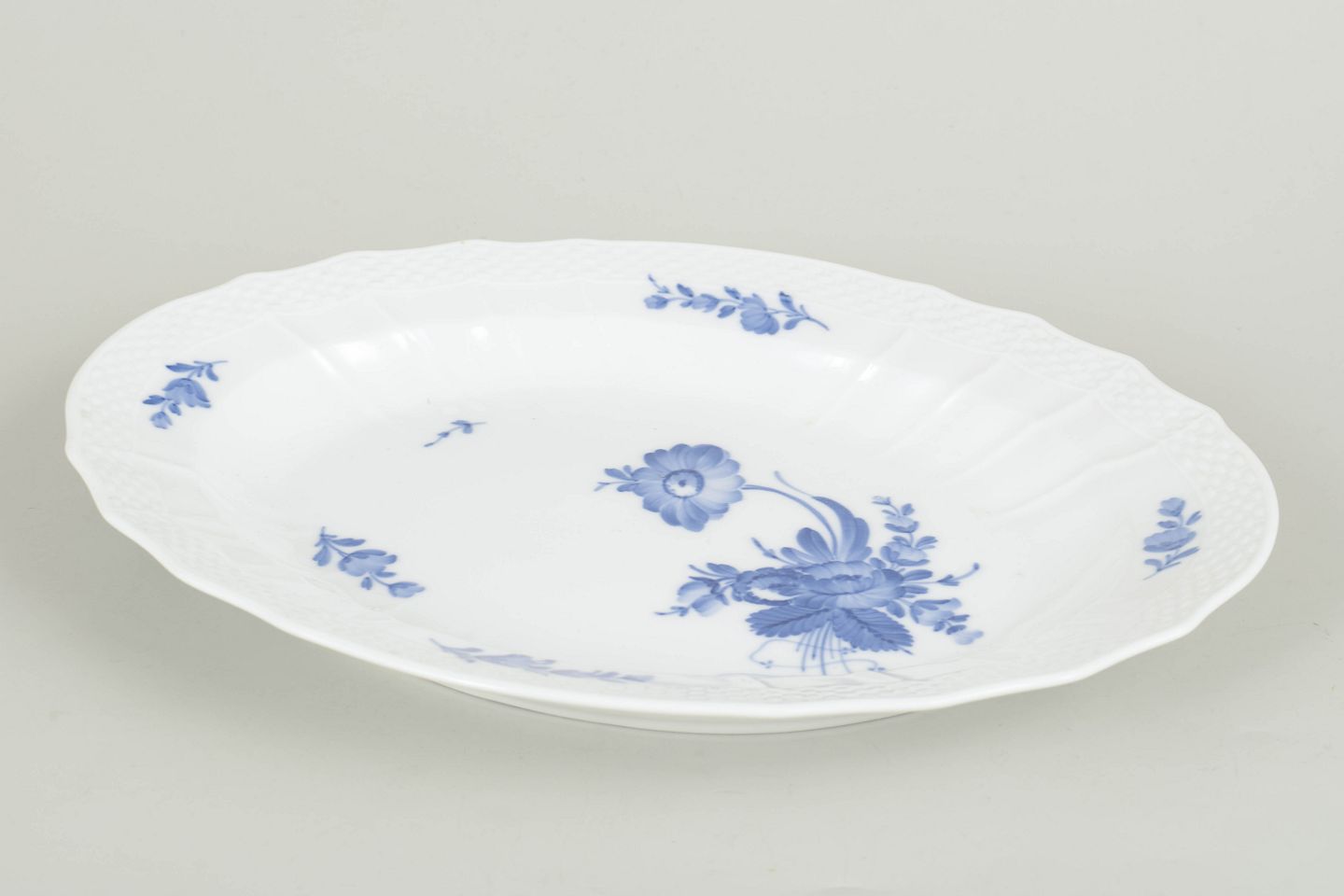 Ovalt serveringsfad i porcelæn dekoreret med håndmalet blå blomsterdekoration i relief. Modelnummer 10/1555, 1. sortering, dateret 1957.