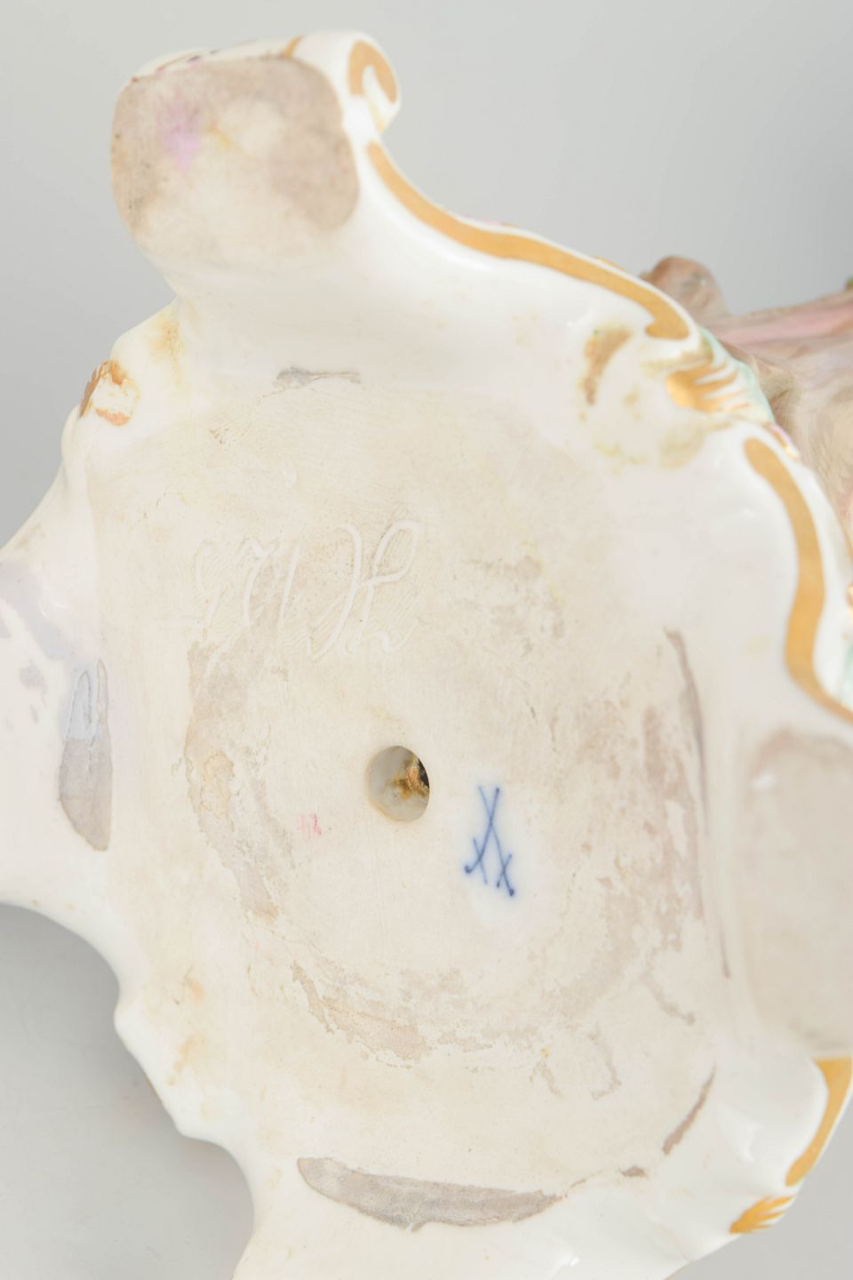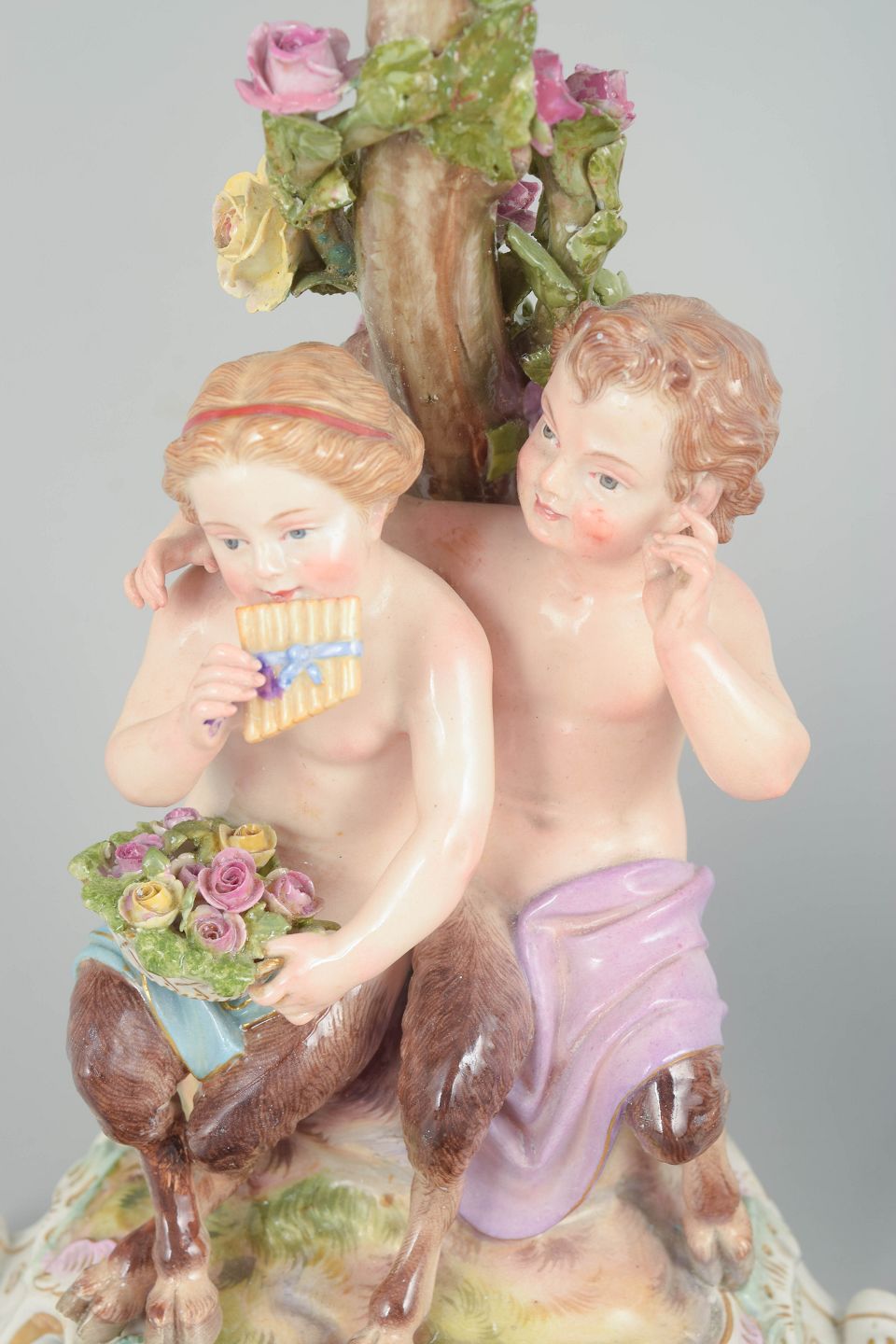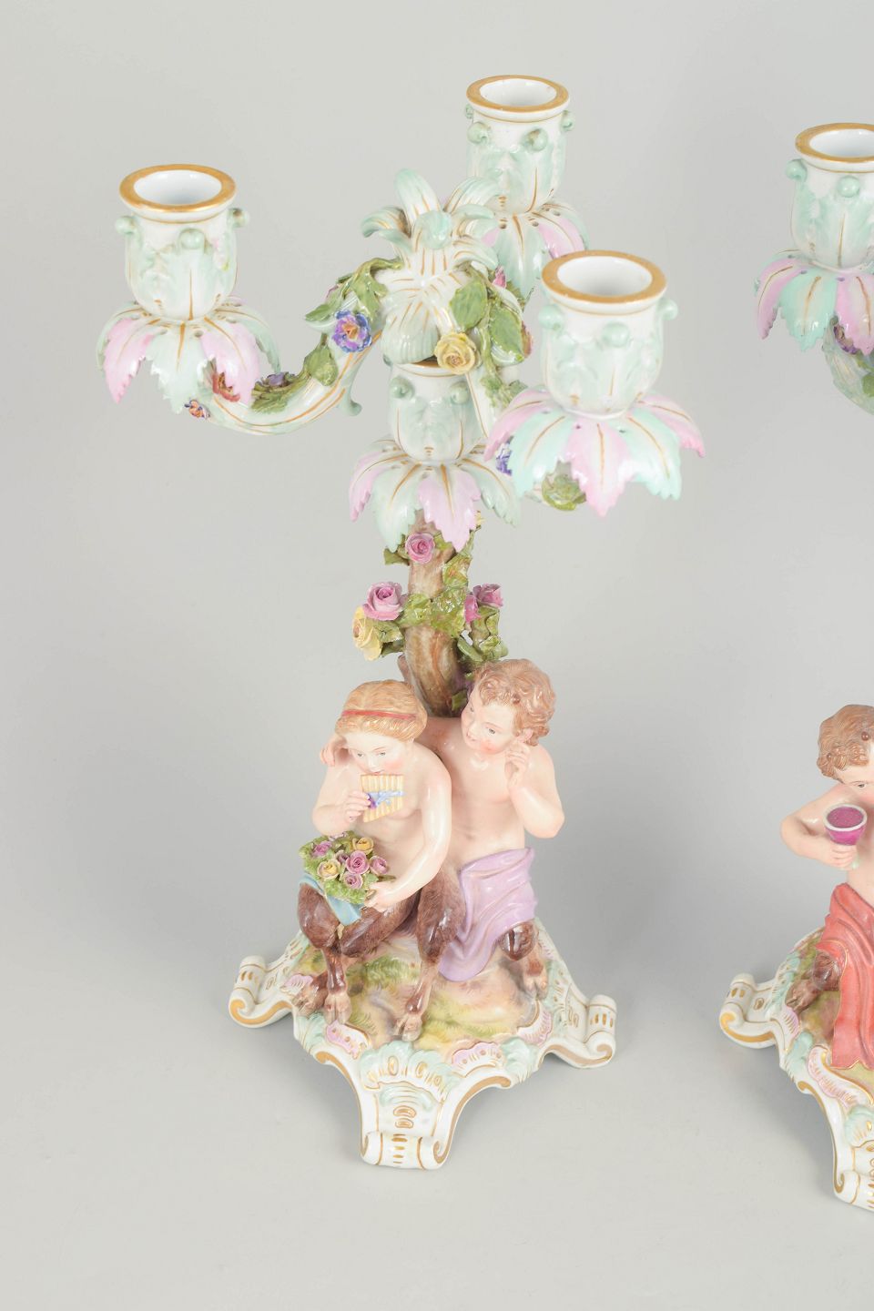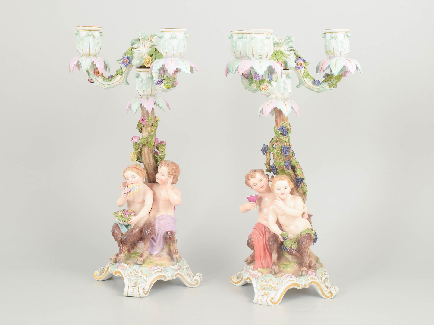 Imponerende og rigt modellerede porcelænslysestager med tre lysarme, udført med naturalistisk træstamme, blomsterdekorationer og figurgrupper med putti og satyrer i polykrom glasur. Undersiden mærket med Meissens krydsede sværd.