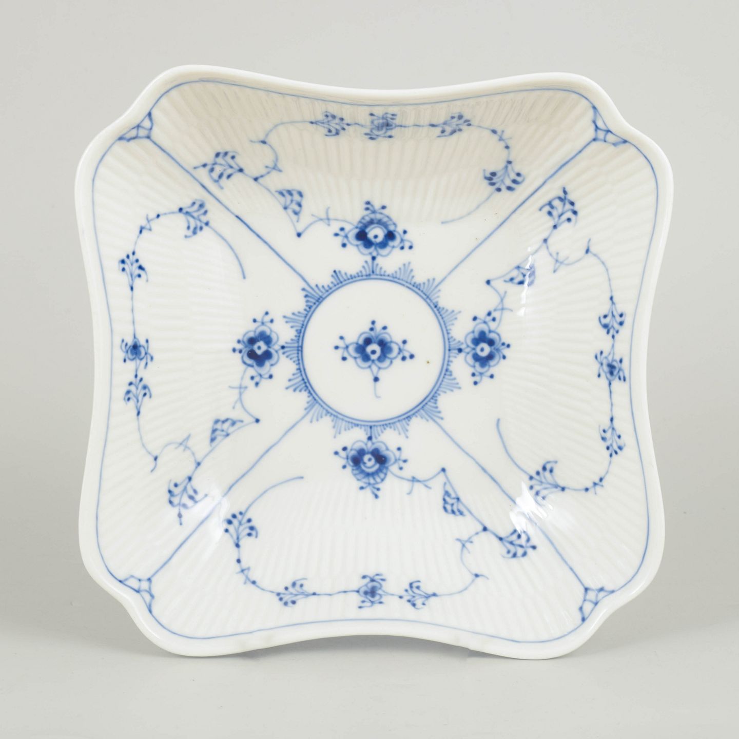 Firkantet fad i porcelæn dekoreret i underglasur blå med klassisk musselmalet riflet mønster. Model 1/26, 1. sortering, dateret 1966.