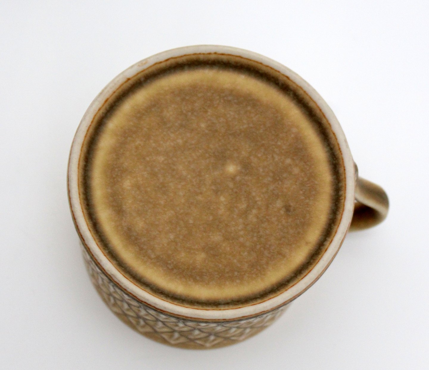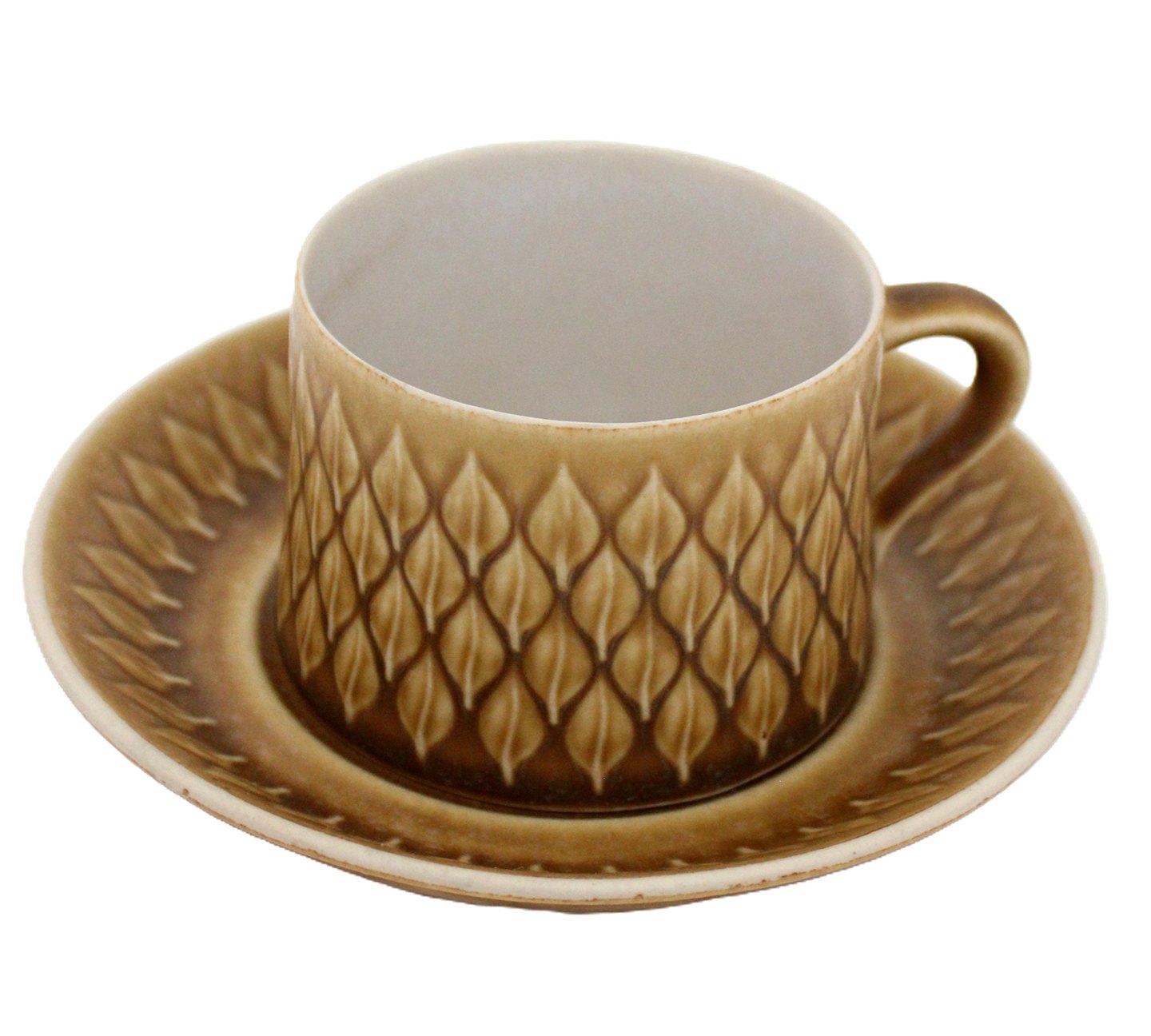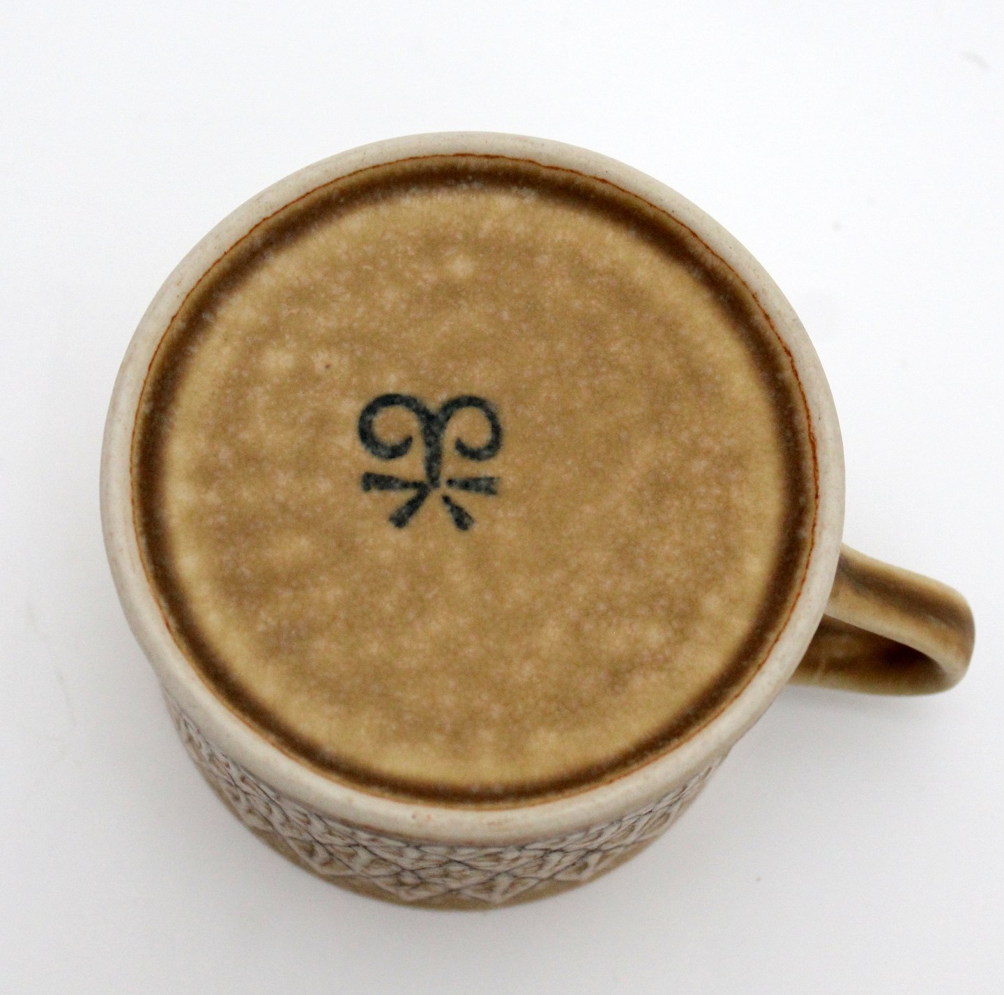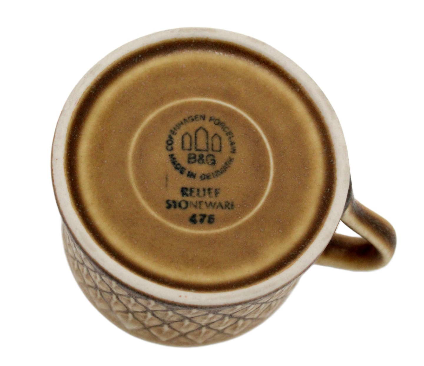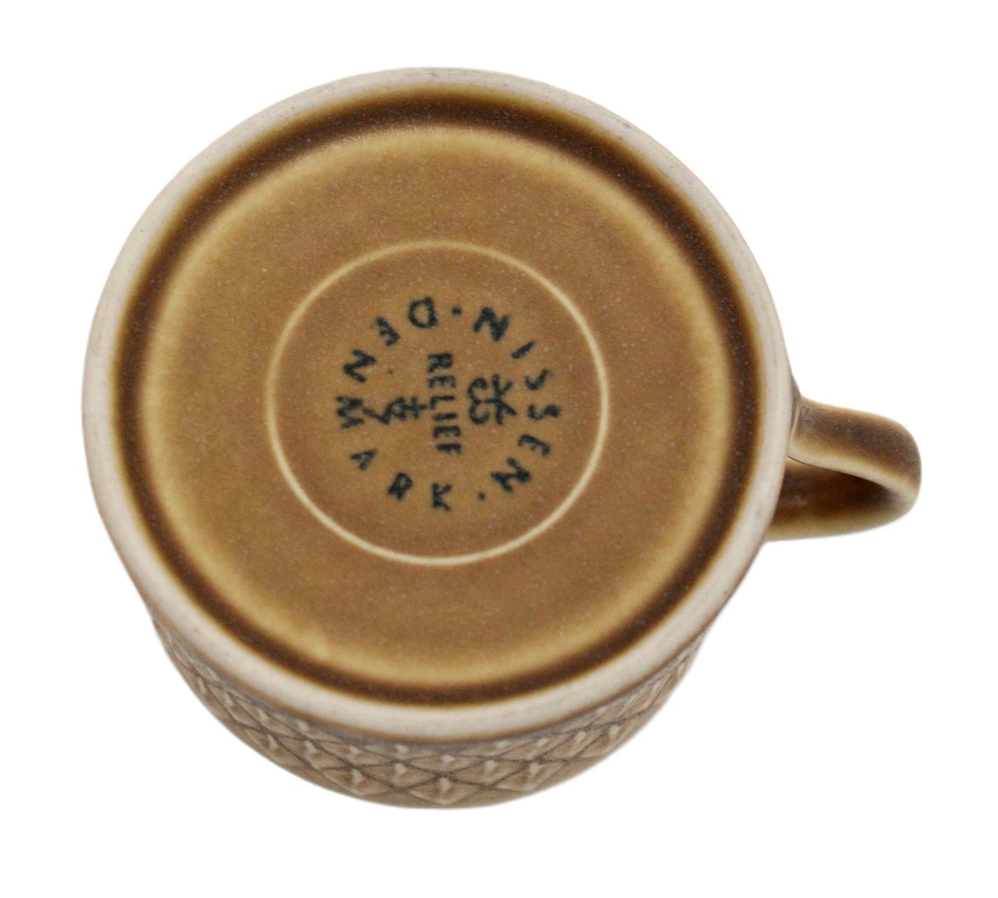 Text zugänglich auf Dänische: Kronjyden/Nissen/Bing & Grøndahl, Relief Tekop med underkop. Designet af Jens Harald Quistgaard. Højde 6 cm. Diameter 7,5 cm.