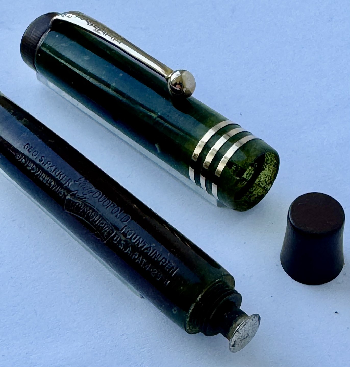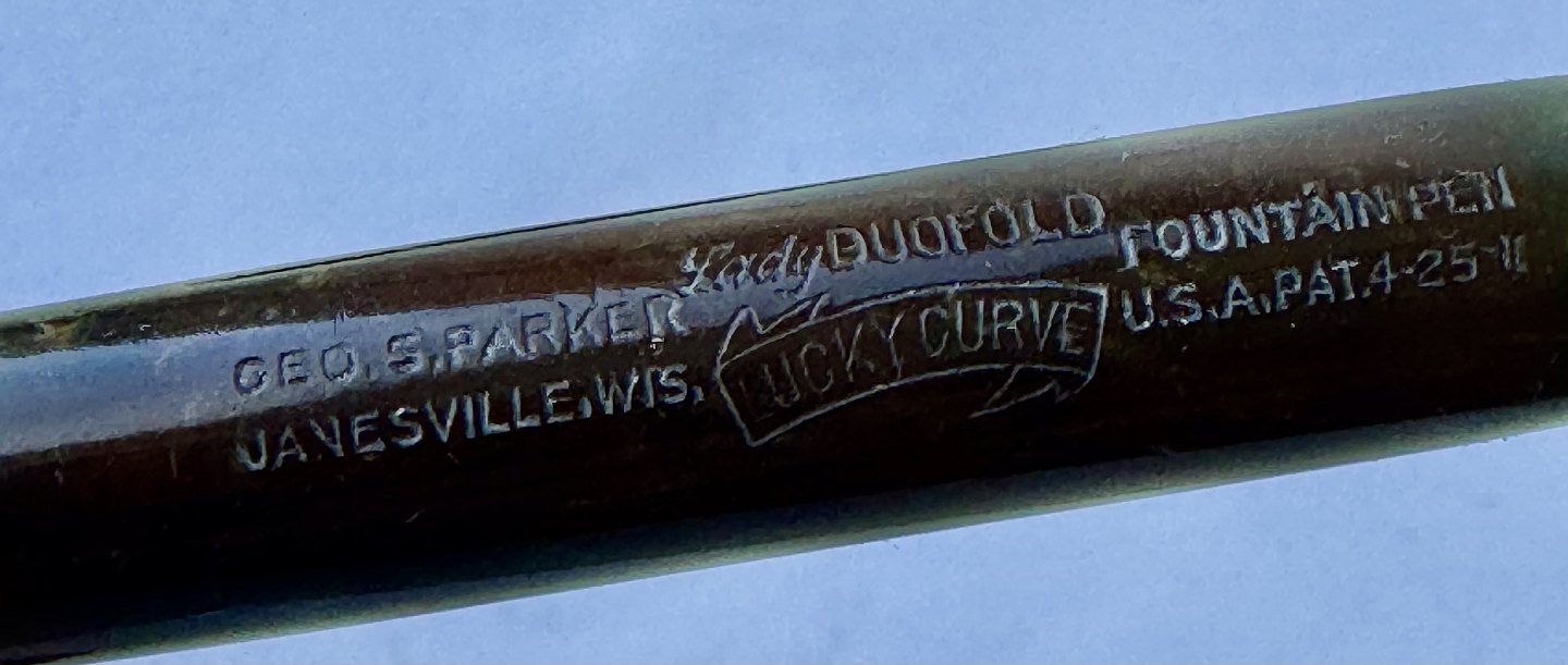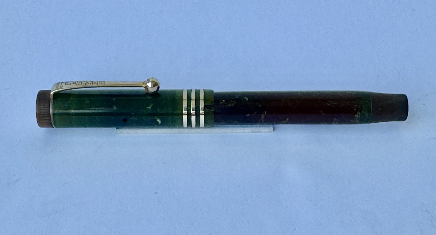 Kort grøn marmoreret Lady Parker Duofold Lucky Curve fyldepen fra omkring 1930. Har et stort skår på hættens åbning, kant. Ellers ingen skader eller reparationer. Push button blæk-påfylder. Der skal indsættes en ny gummisæk før end fyldepennen igen kan optage blæk og skrive. 11,5 cm lang.