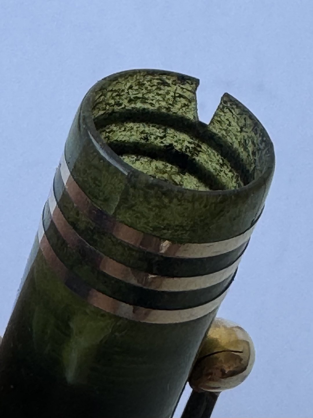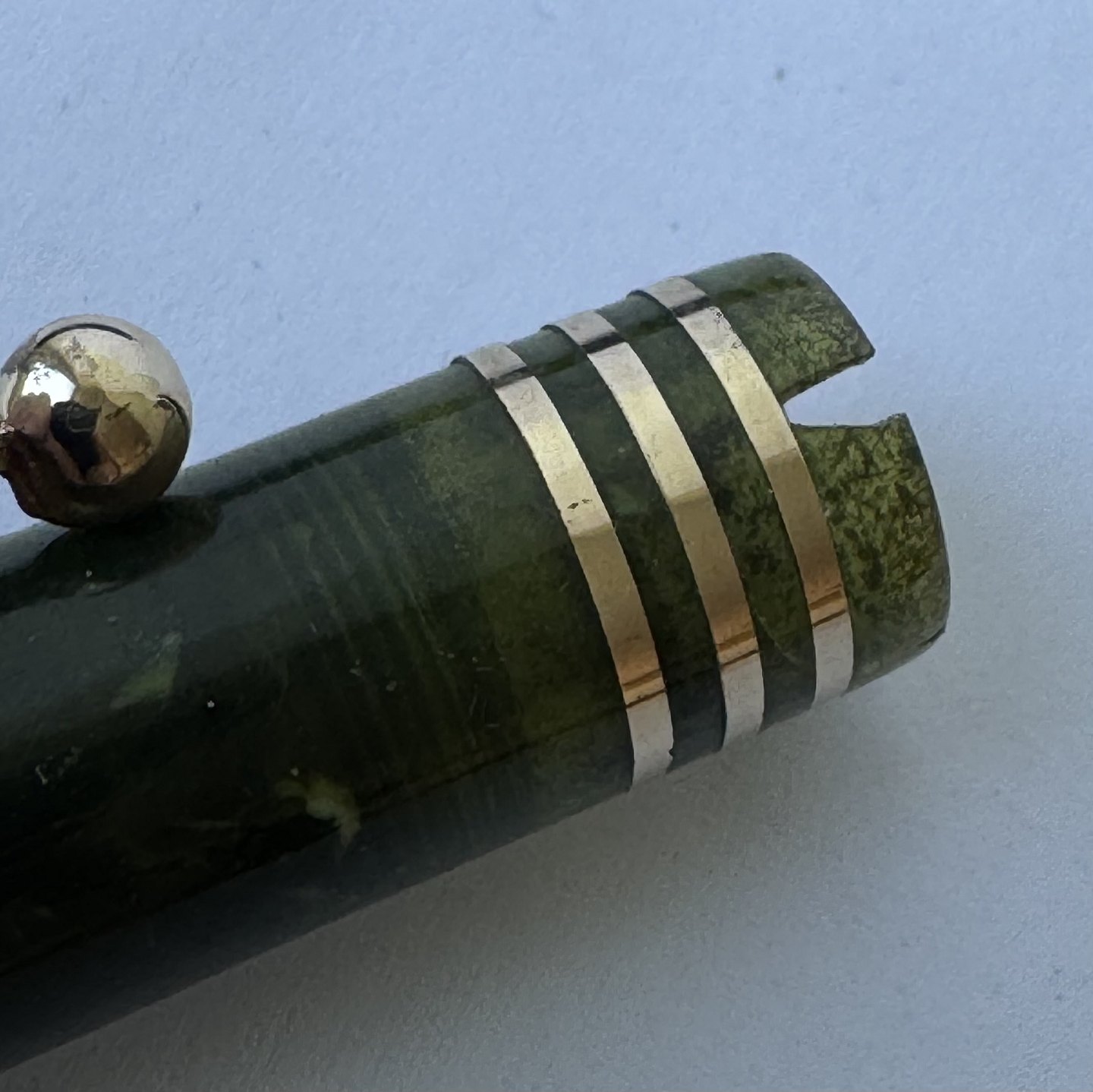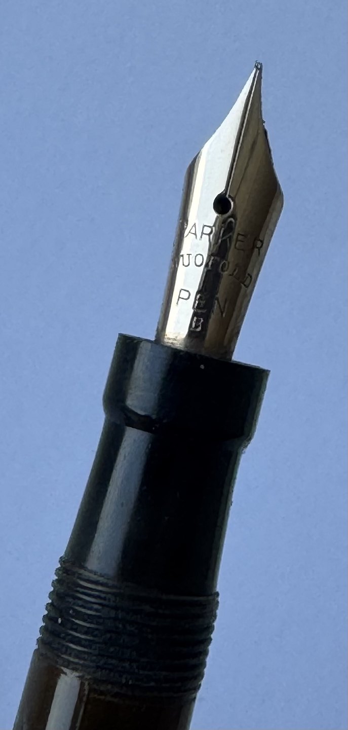 Kort grøn marmoreret Lady Parker Duofold Lucky Curve fyldepen fra omkring 1930. Har et stort skår på hættens åbning, kant. Ellers ingen skader eller reparationer. Push button blæk-påfylder. Der skal indsættes en ny gummisæk før end fyldepennen igen kan optage blæk og skrive. 11,5 cm lang.