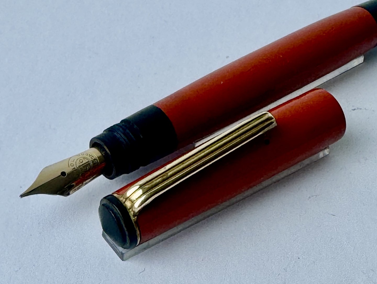 Mindre koralrød Penol-Scout Ambassador fyldepen. Push button filler. Der skal indsættes en ny gummisæk før den igen kan optage blæk og skrive igen. Ny gummisæk kan indsættes for et tillæg på kr. 250,- Alle dele originale til denne model. Ingen skader eller reparationer. Lette almindelige brugsspor på overfladen. Længde 11,7 cm