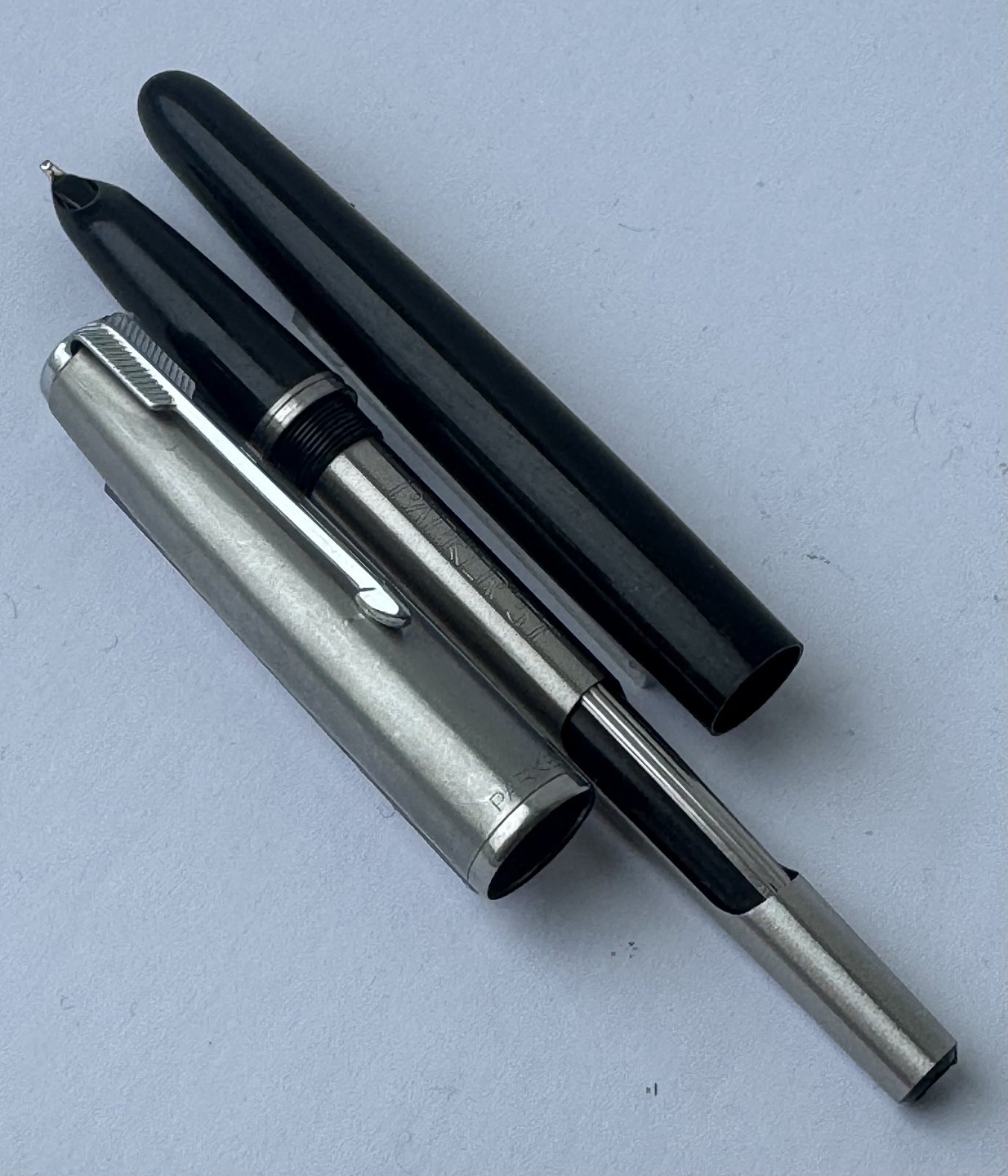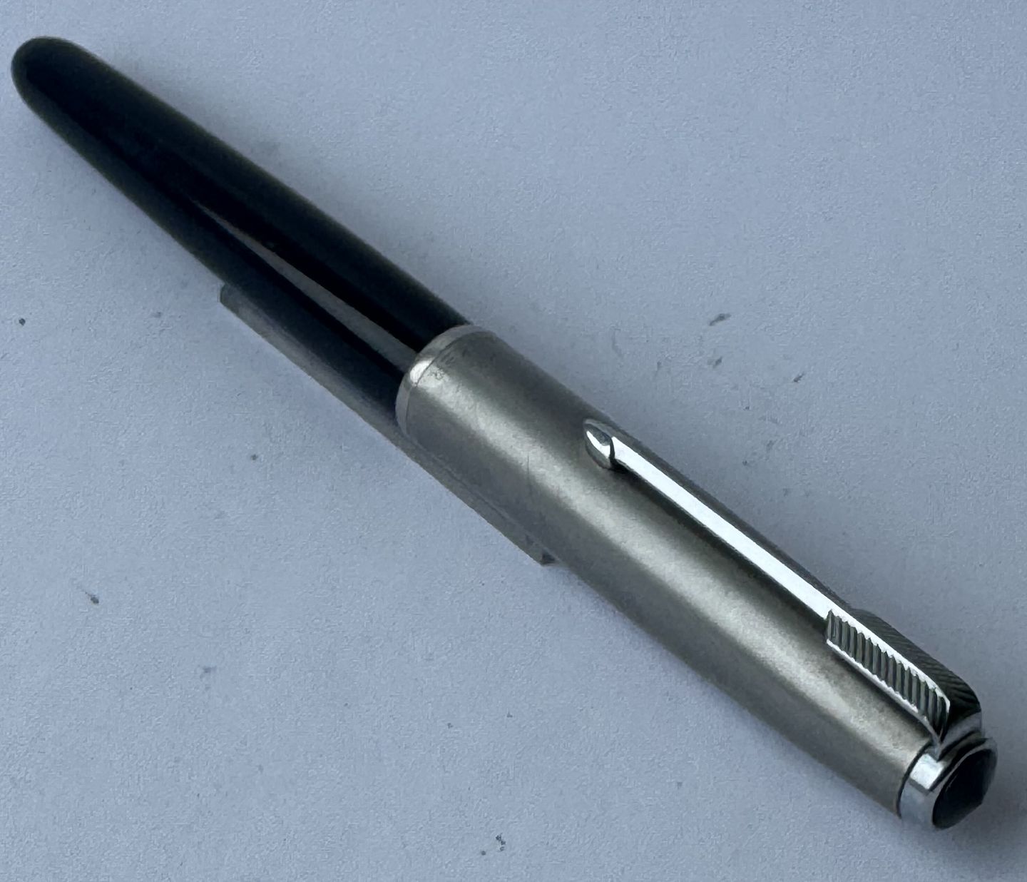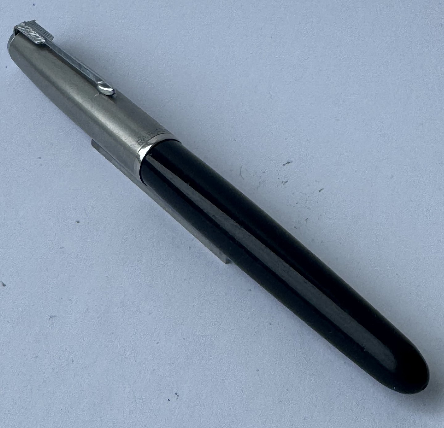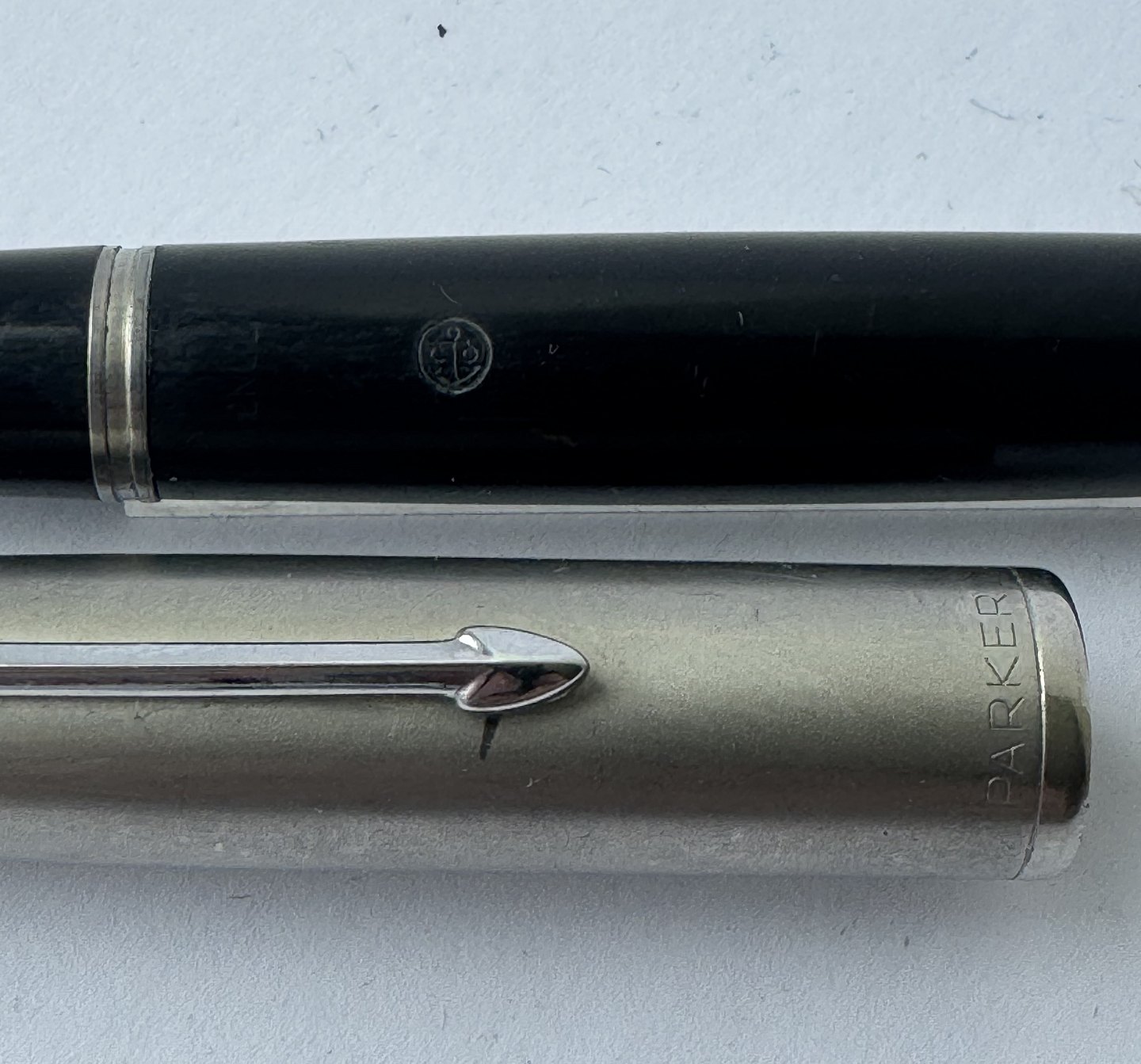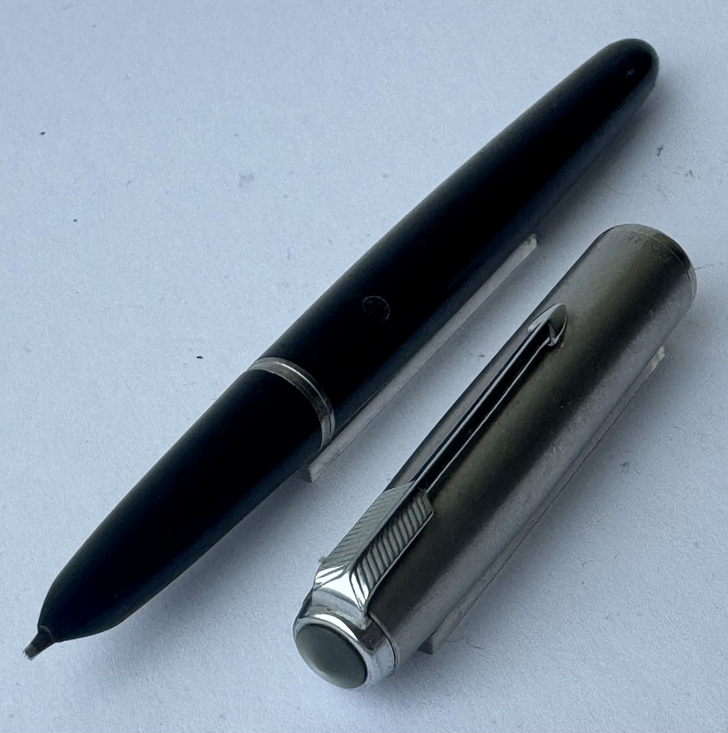 Sort Parker 51 fyldepen med hætte i stål fra 1950’erne. Fremstår i god og funktionsdygtig stand. Ingen fejl eller mangler at beskrive. På siden ses “the danish anchor”, som er fyldepenne producenten og forhandleren Christian Olsens firmalogo. Fyldepenne der var importeret til Chr. Olsens fabrikker blev stemplet med dette logo lige såvel som virksomhedens egne produkter, eksempelvis Penol.