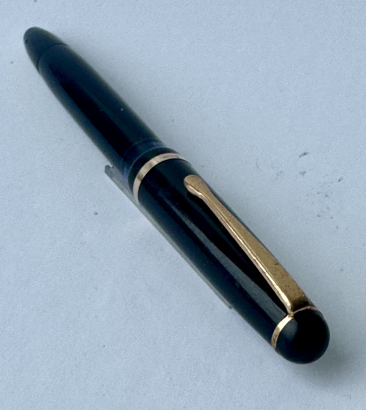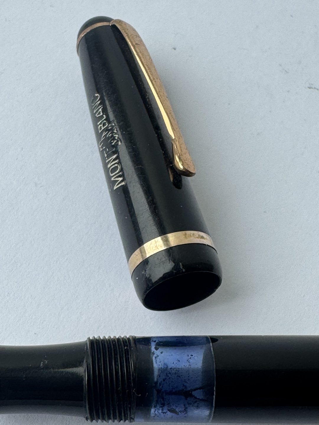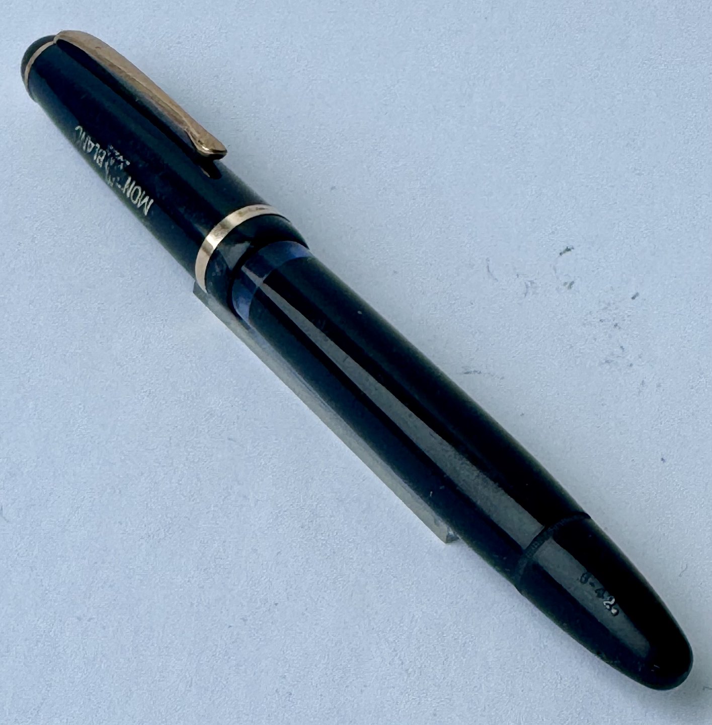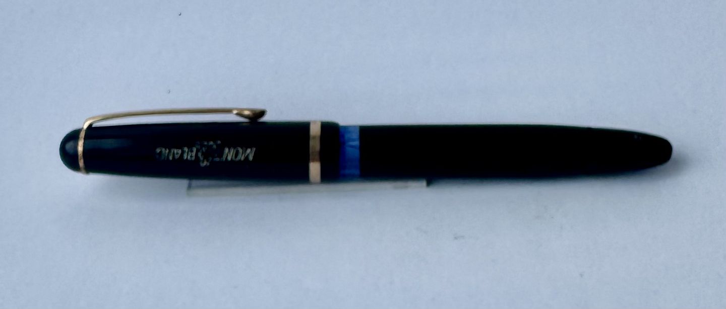 Sort Montblanc 3-42 fyldepen fra 1950’erne. Piston blæk-påfylder. Denne mekanisme fungerer fint, hvorfor pennen er klar til at blive brugt. Alle dele originale til denne model. Inklusiv en nr. 2 Montblanc stålspids. Ingen skader eller reparationer. Længde 12,7 cm
