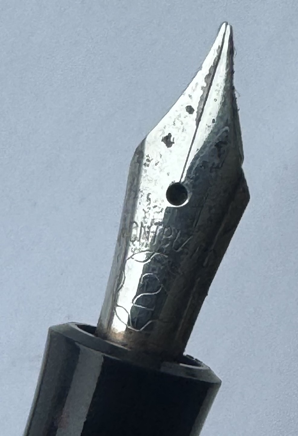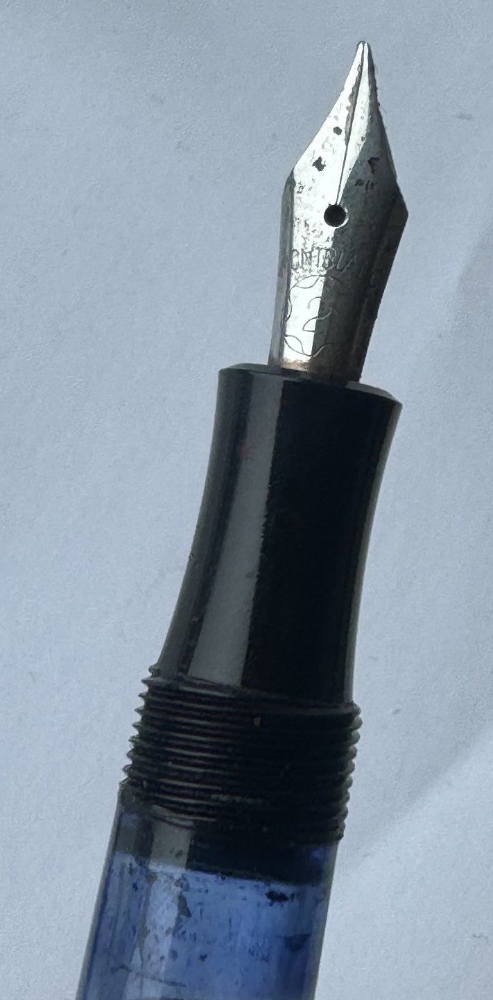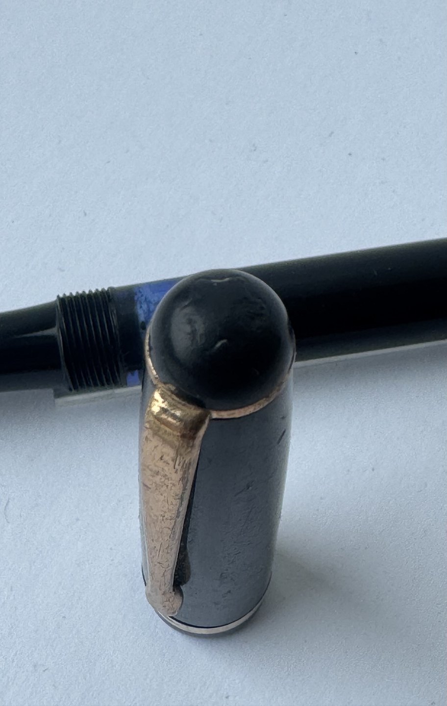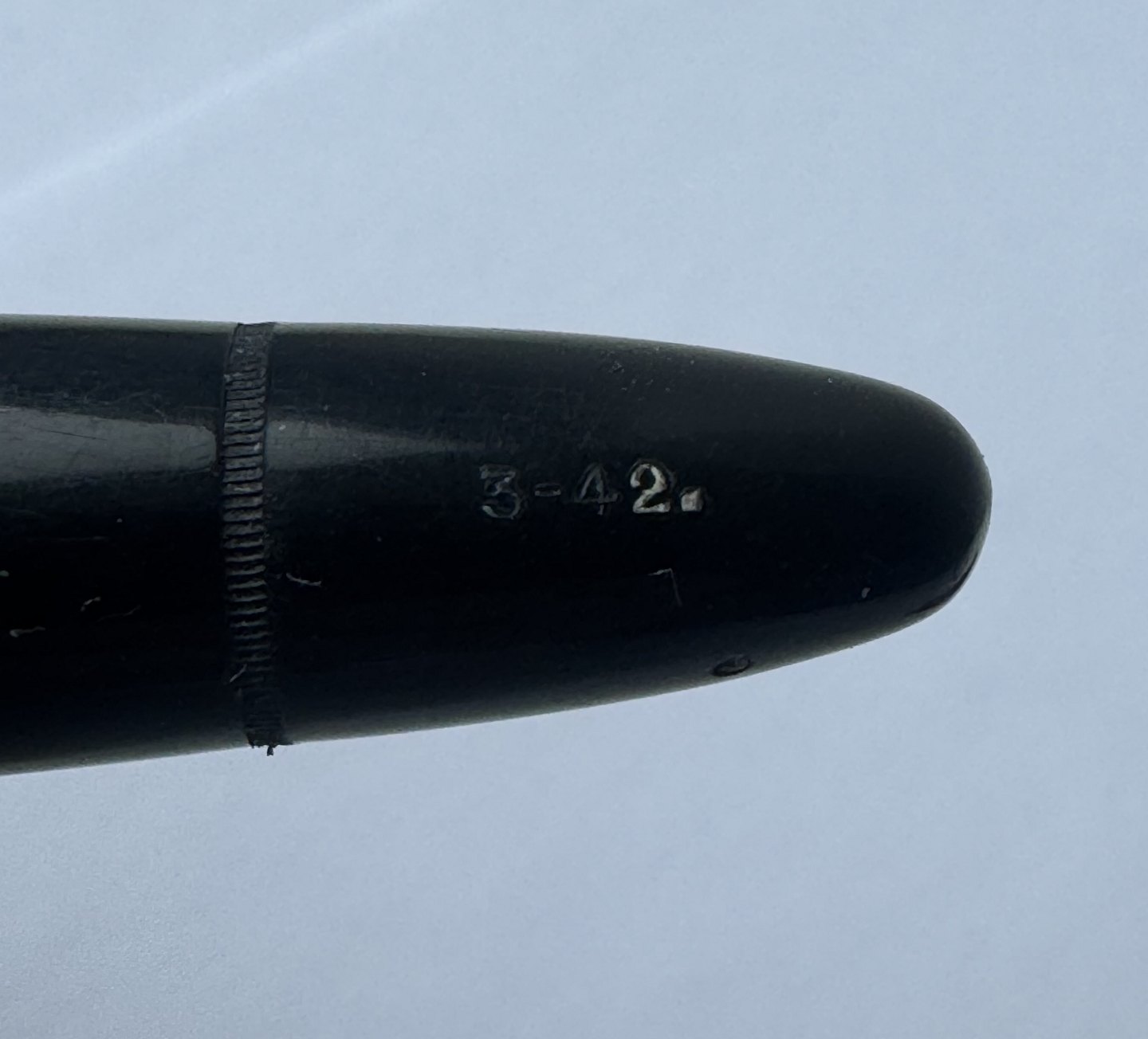Sort Montblanc 3-42 fyldepen fra 1950’erne. Piston blæk-påfylder. Denne mekanisme fungerer fint, hvorfor pennen er klar til at blive brugt. Alle dele originale til denne model. Inklusiv en nr. 2 Montblanc stålspids. Ingen skader eller reparationer. Længde 12,7 cm
