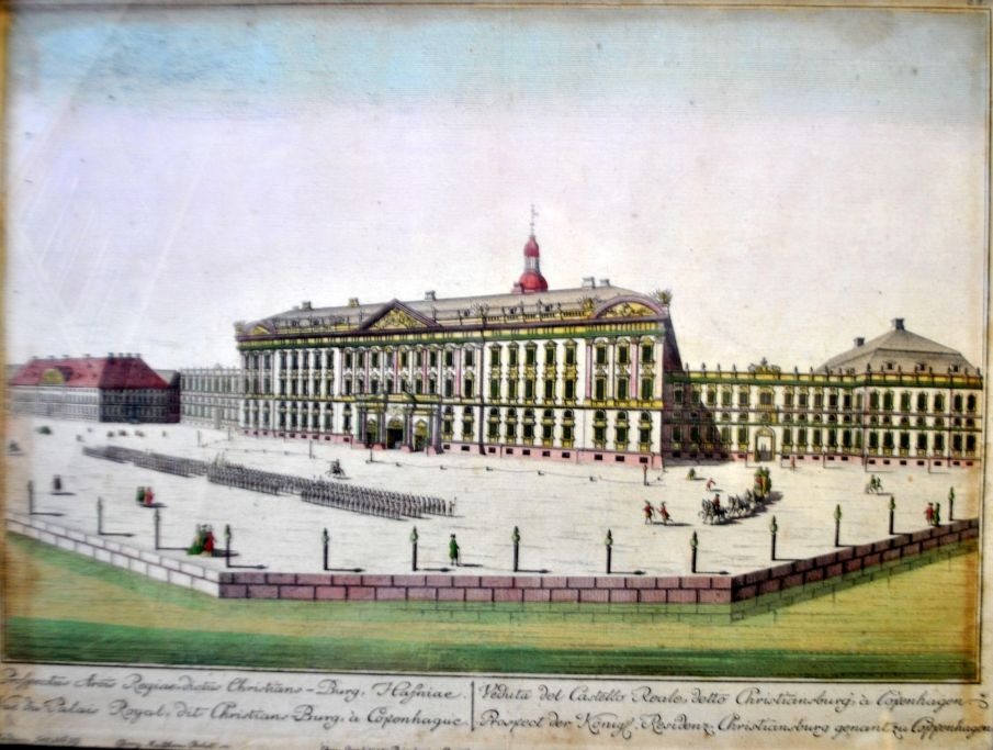Probst, Georg Balthasar (1673–1747). Deutschland: Schloss Christianborg, Kopenhagen. Handkolorierter Kupferstich. Signiert. 32 × 42 cm.