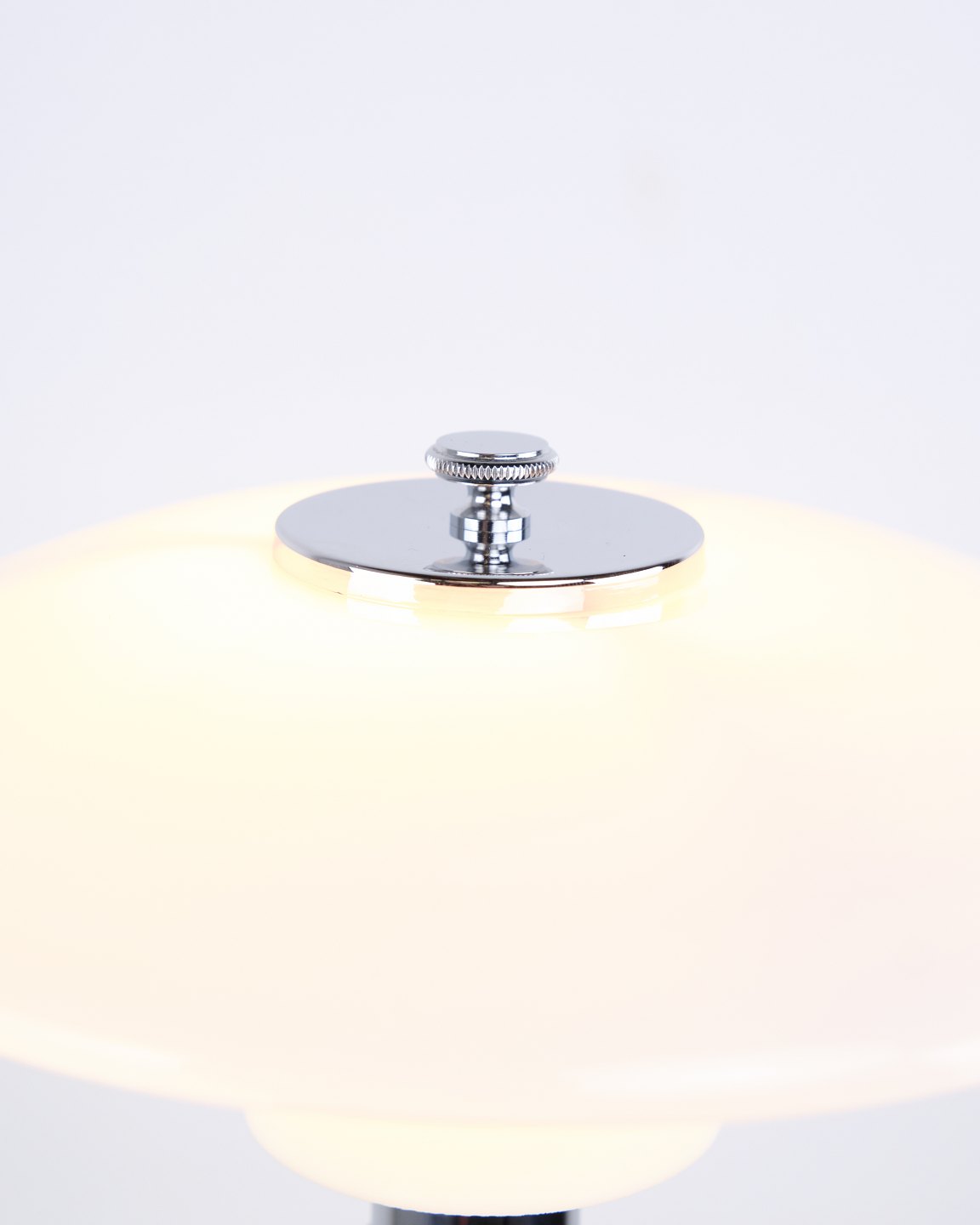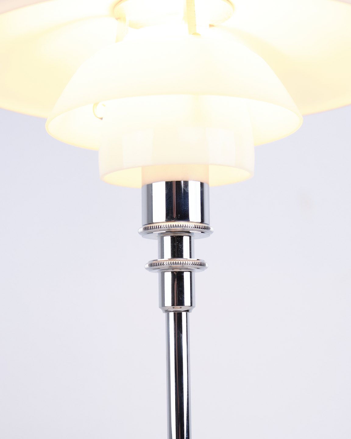 Klassische PH 2/1 Tischlampe, entworfen von Poul Henningsen und hergestellt von Louis Poulsen. Die Lampe ist in Chrom ausgeführt mit Schirmen aus weißem Opalglas, was ihr ein leichtes und elegantes Erscheinungsbild verleiht. Das Modell besteht aus einem oberen Schirm von ca. 20 cm kombiniert mit Mittel- und Unterschirmen der PH 1/1, was eine besondere Proportion im Design schafft.