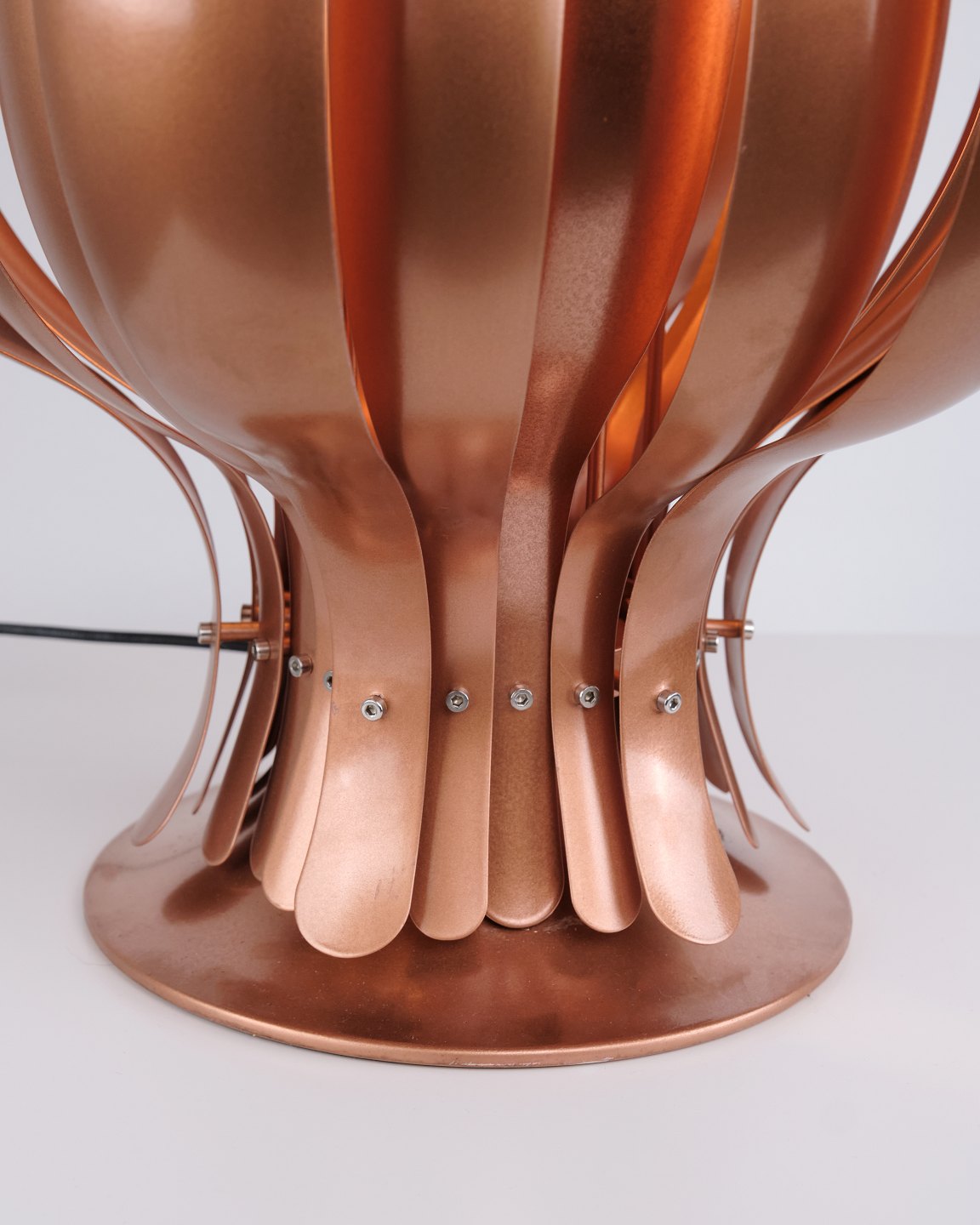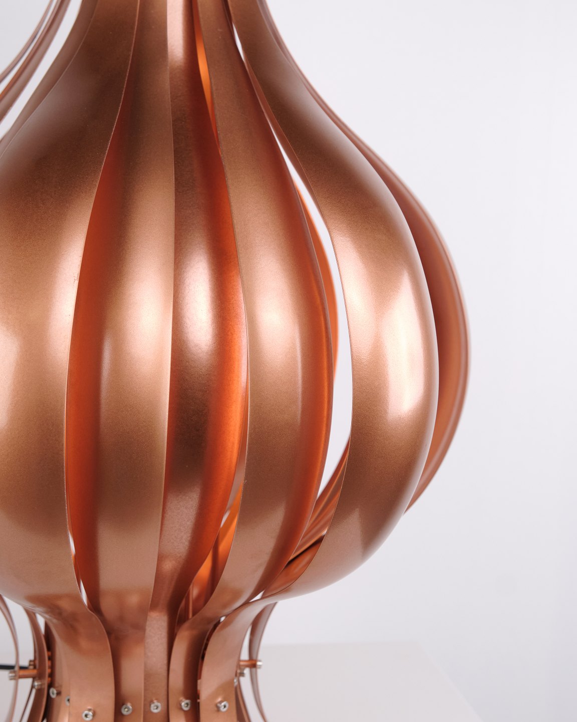 Seltene Onion Tischlampe, entworfen von Verner Panton in den 1970er Jahren. Die Lampe ist aus Kupfer gefertigt und zeichnet sich durch ihre organische, geschichtete Form aus, die einen skulpturalen und dekorativen Ausdruck schafft. Die Konstruktion erzeugt ein weiches und stimmungsvolles Licht, wobei die Reflexionen im Kupfer den Charakter der Lampe hervorheben.