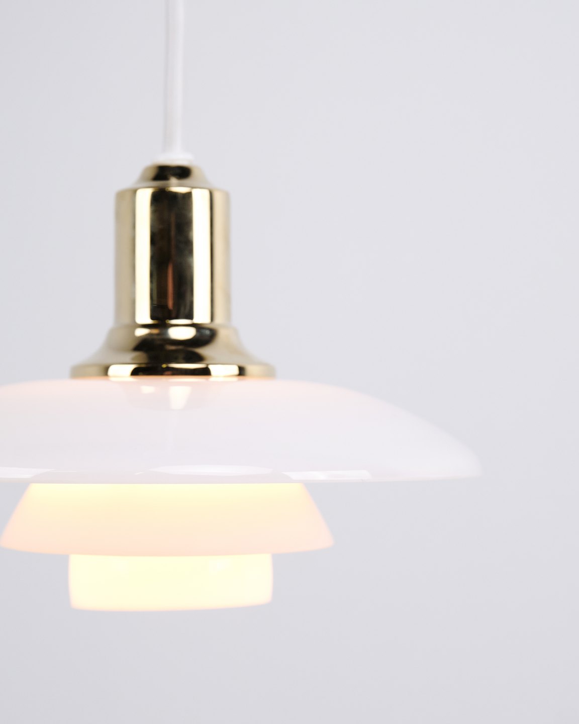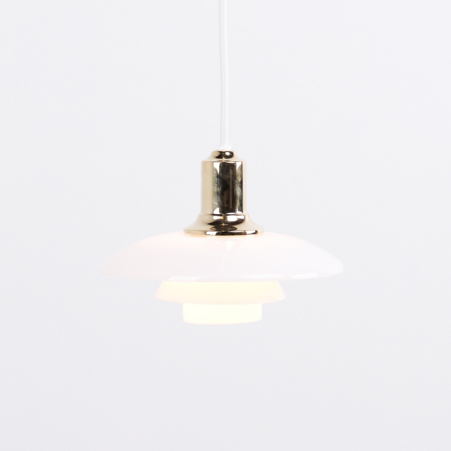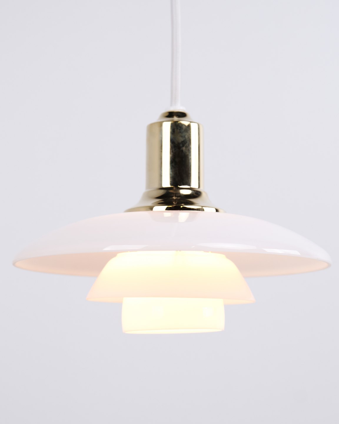 PH 2/1 Pendelleuchte aus Messing mit Opalglas von Louis Poulsen. Entworfen von Poul Henningsen mit klassischem dänischem Lichtdesign und blendfreier Beleuchtung.