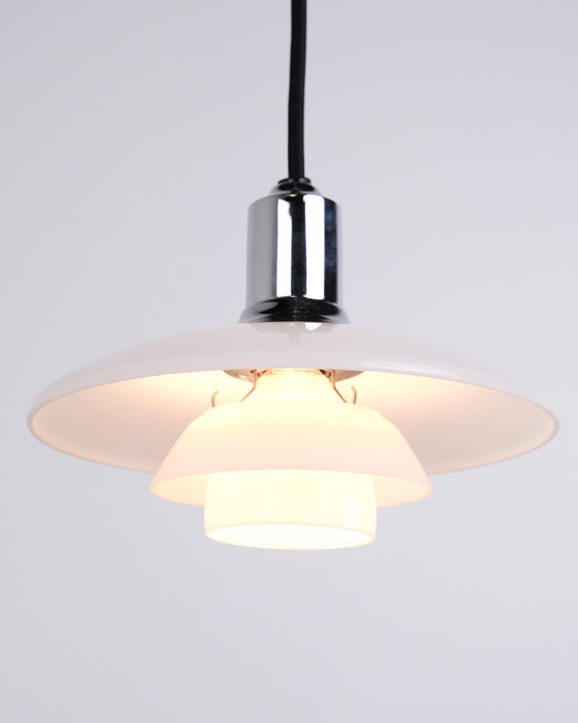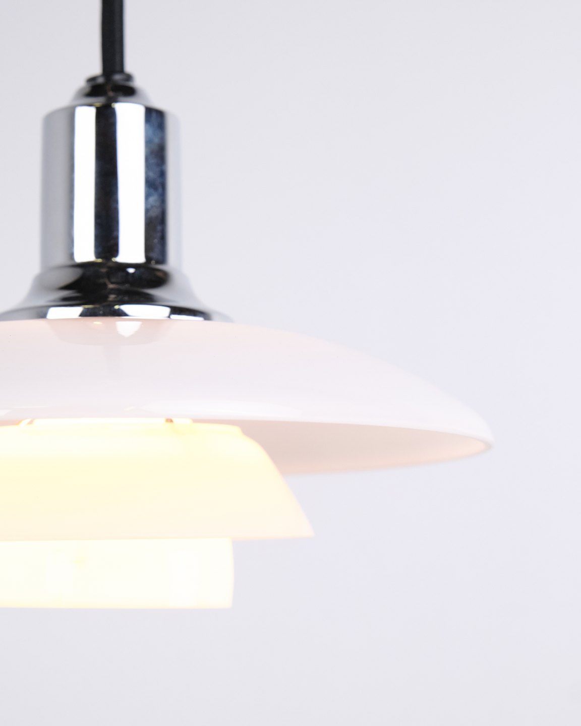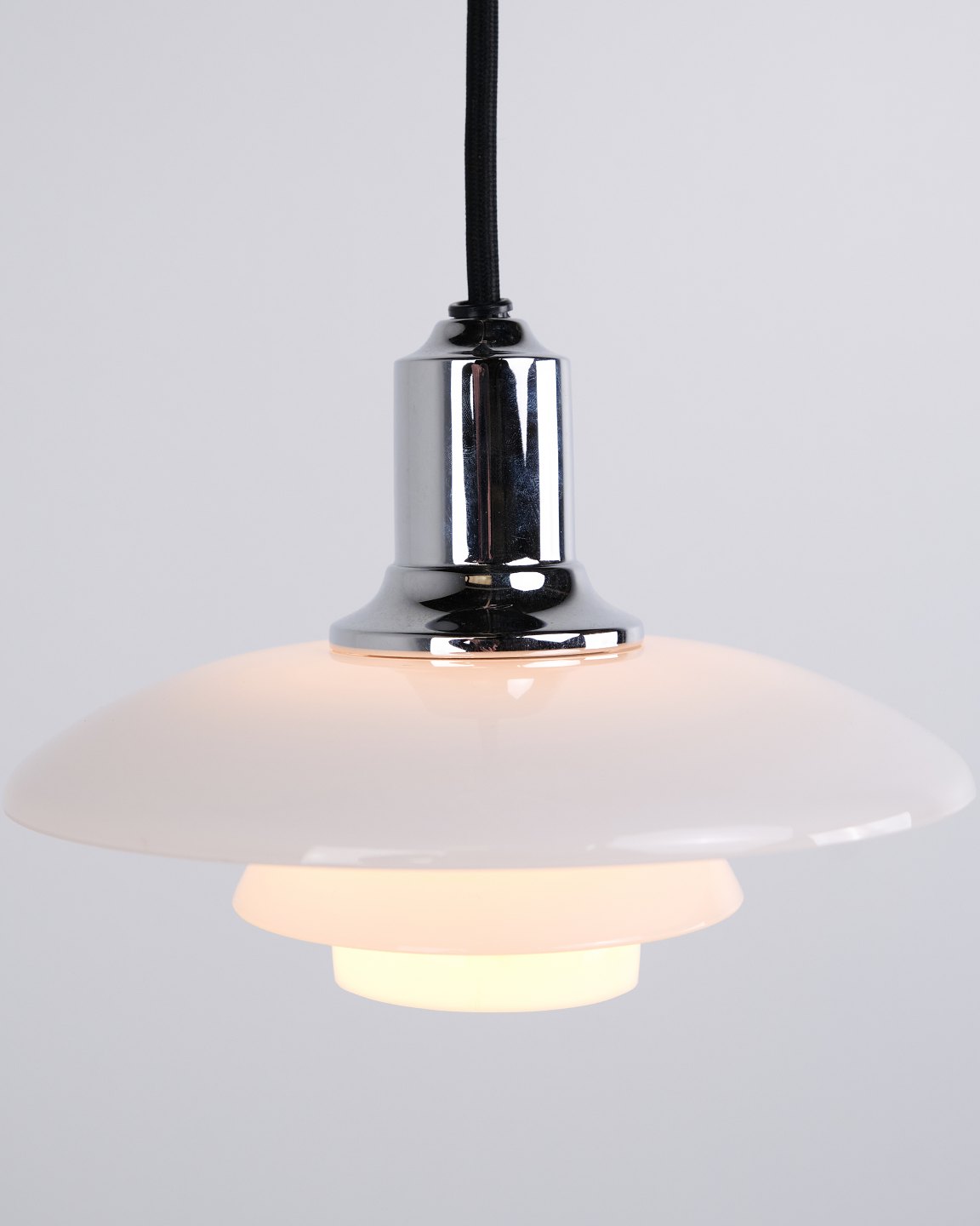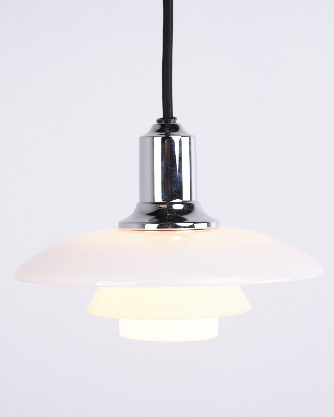 PH 2/1 Pendelleuchte in Chrom mit Opalglas von Louis Poulsen. Entworfen von Poul Henningsen mit klassischem dänischem Lichtdesign und blendfreier Beleuchtung.