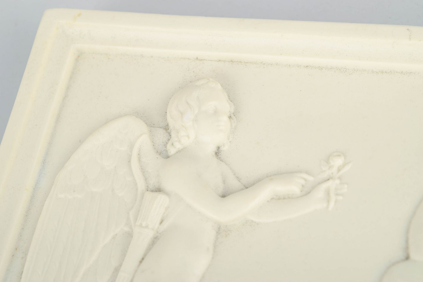 Rektangulært vægrelief i hvidt bisquitporcelæn med klassicistisk figurmotiv efter Bertel Thorvaldsen, udført med fine detaljer og blød modellering i nyklassicistisk stil.