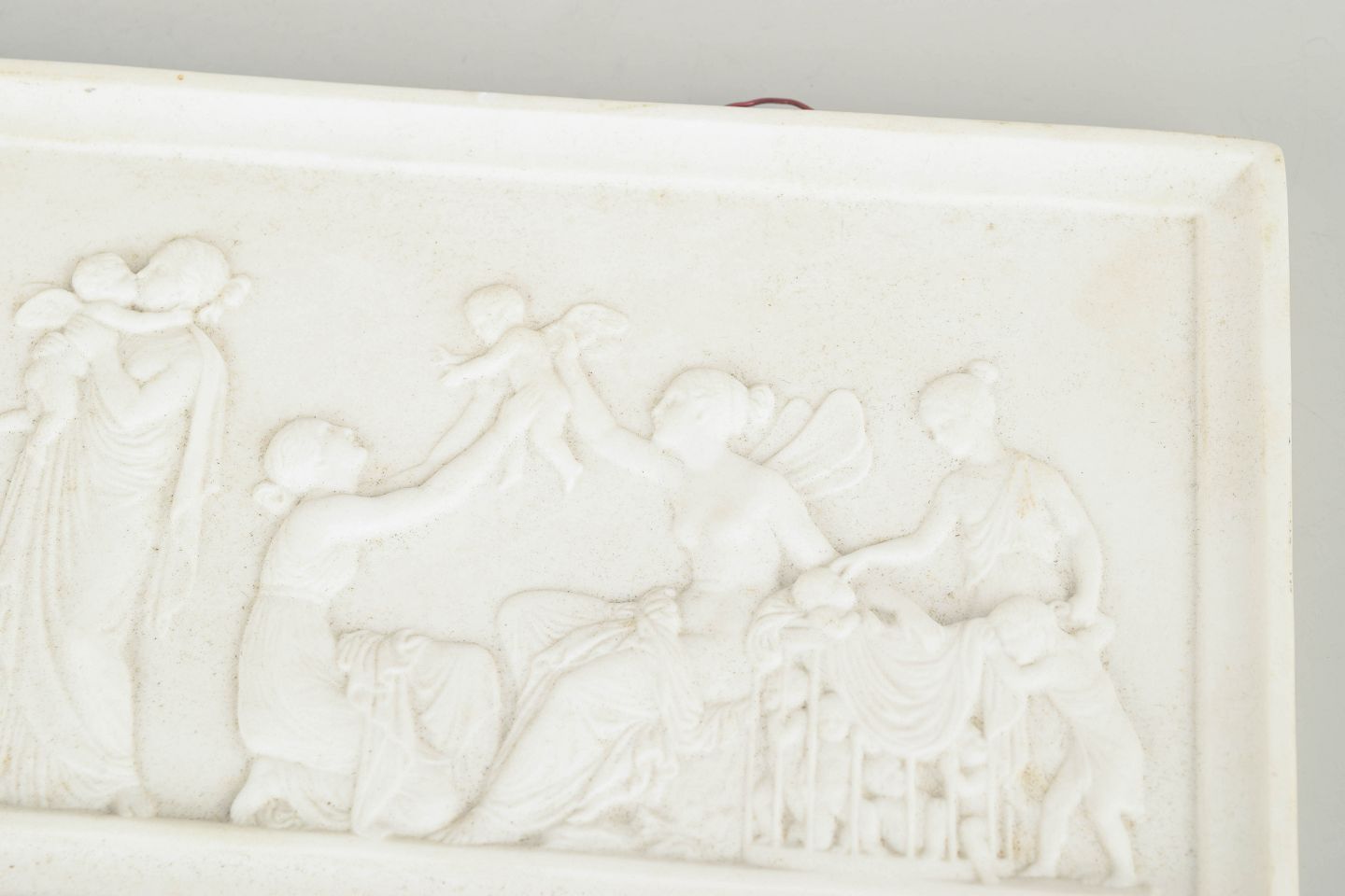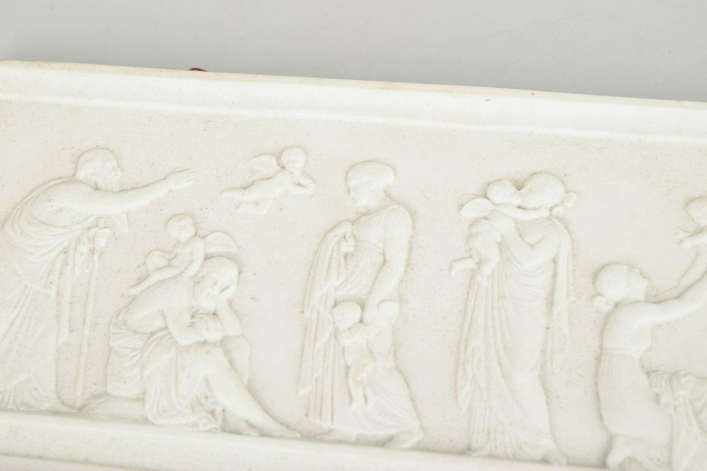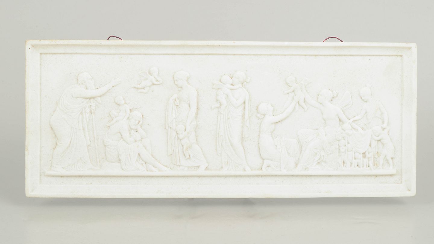 Rektangulært vægrelief i hvidt bisquitporcelæn med klassicistisk figurfrise efter Bertel Thorvaldsen, udført med fine detaljer og harmonisk komposition inspireret af antikkens formsprog.