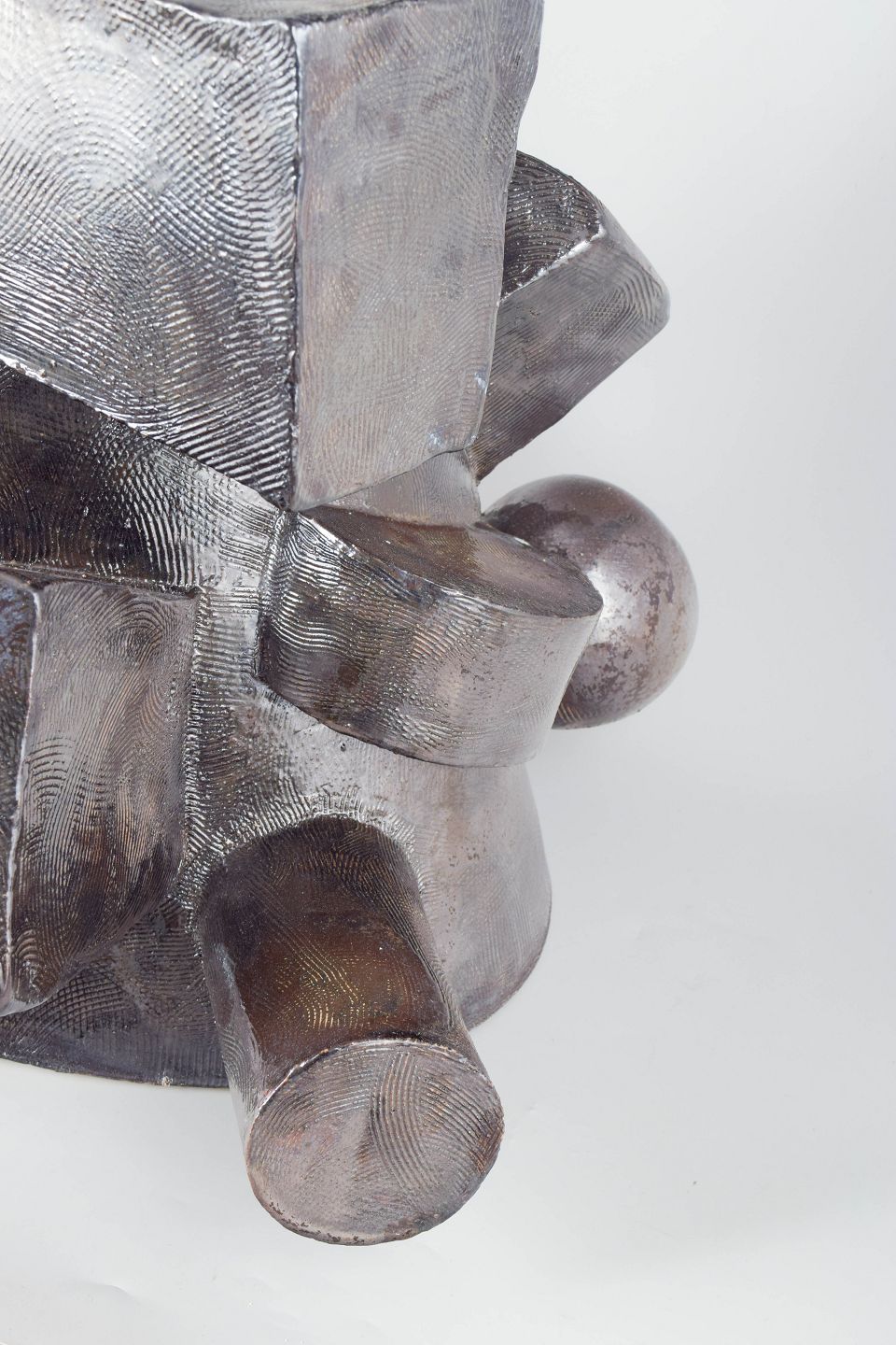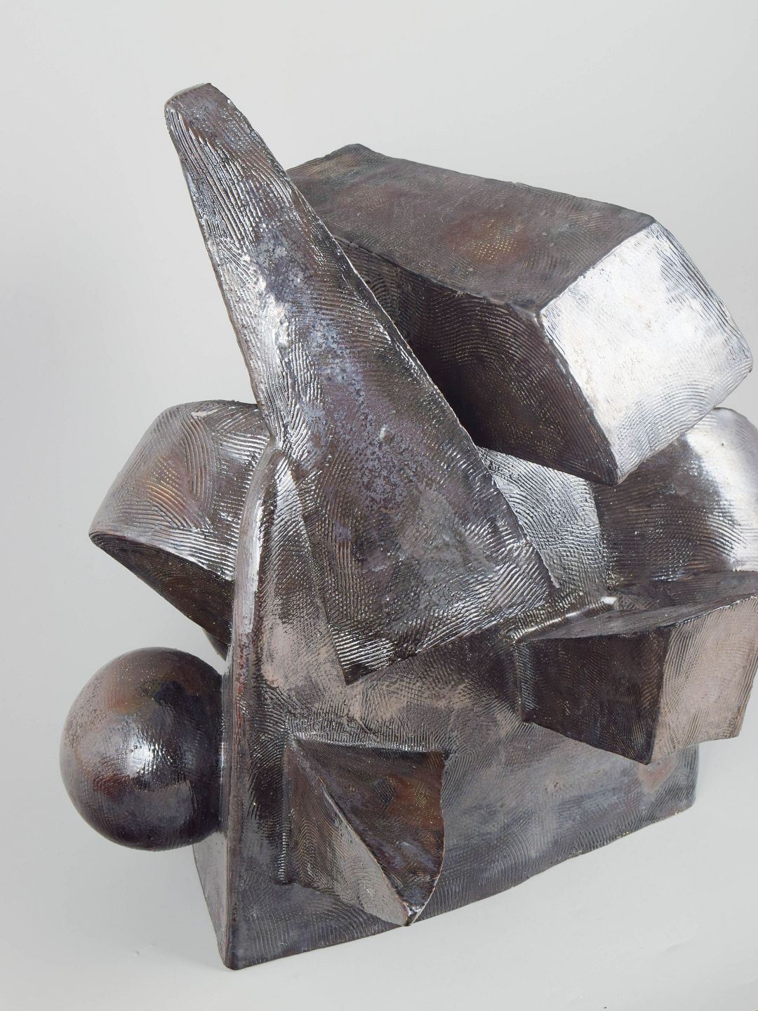 Monumentalt stor skulptur i kubistisk stil, med glat, næsten metallisk overflade. Mørkegrå, næsten sort glasur med brune områder.