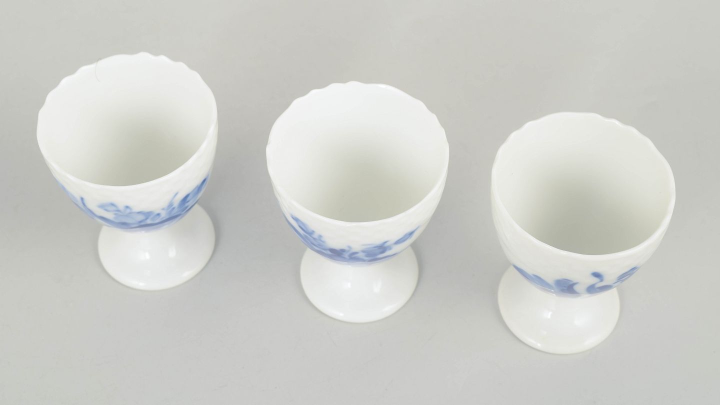 Sæt bestående af tre æggebægre i porcelæn med håndmalet blå blomsterdekoration i relief. Modelnummer 10/1568, 1. sortering, fra tidligt 1900-tal.
