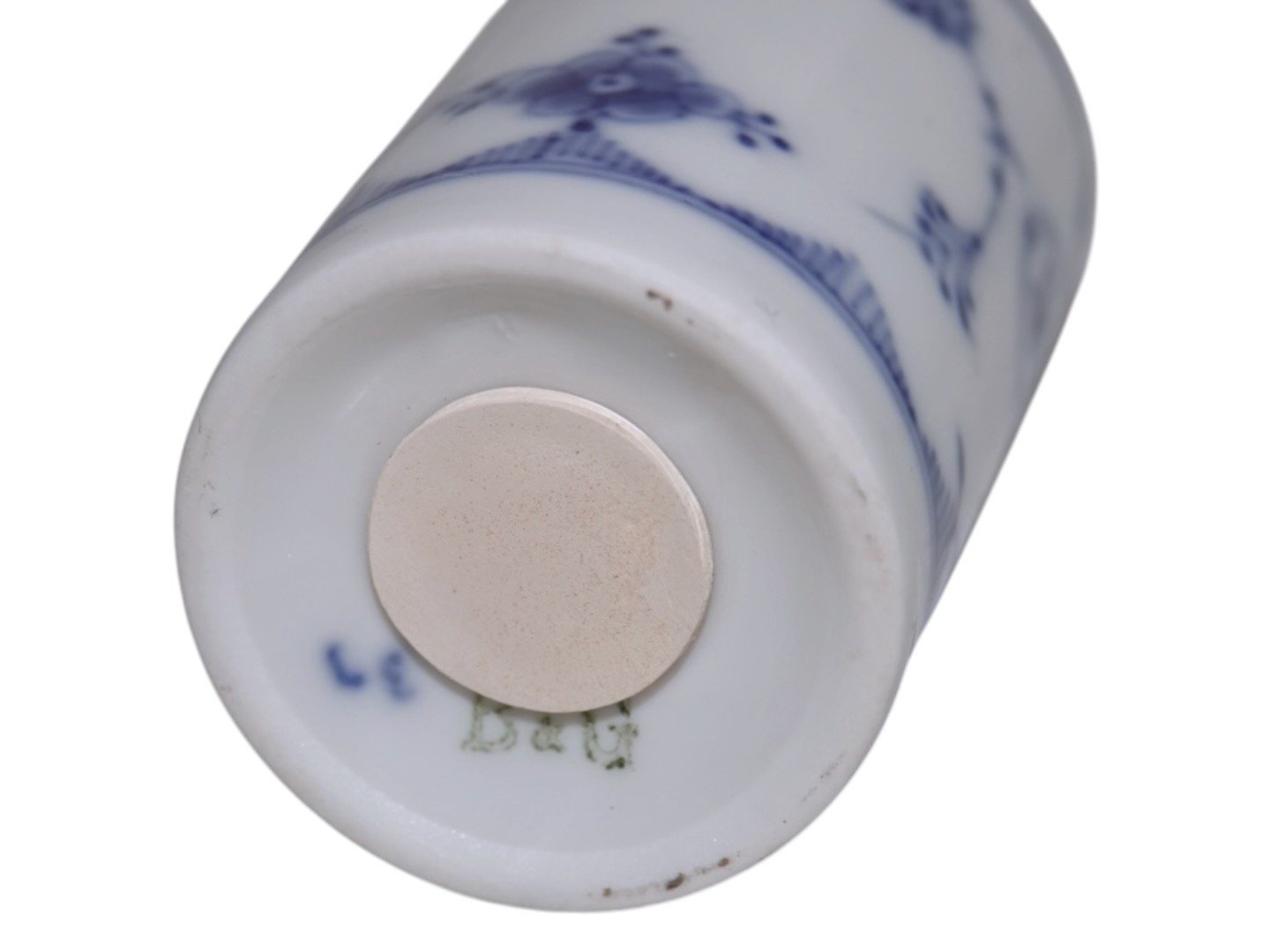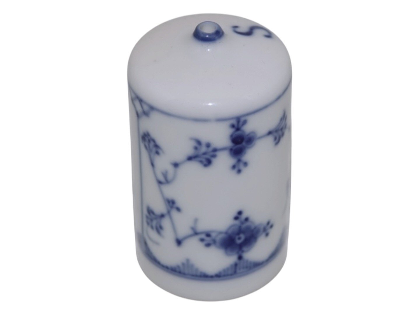 Bing & Grøndahl Blåmalet (Musselmalet), saltbøsse i tykt jernporcelæn med logo på den ene side.
