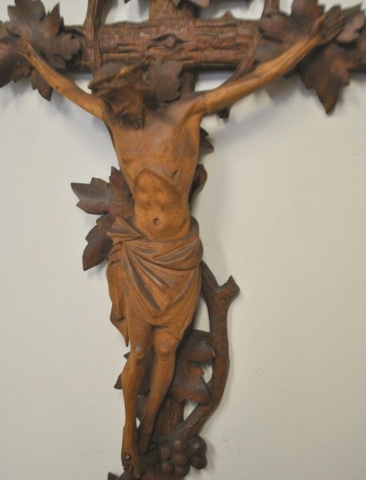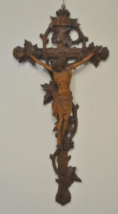 Geschnitztes Holzkreuz, Deutschland, 19. Jahrhundert. Das Kreuz ist mit Weinreben, Trauben und Rinde verziert. Höhe: 48 cm, Breite: 22 cm.