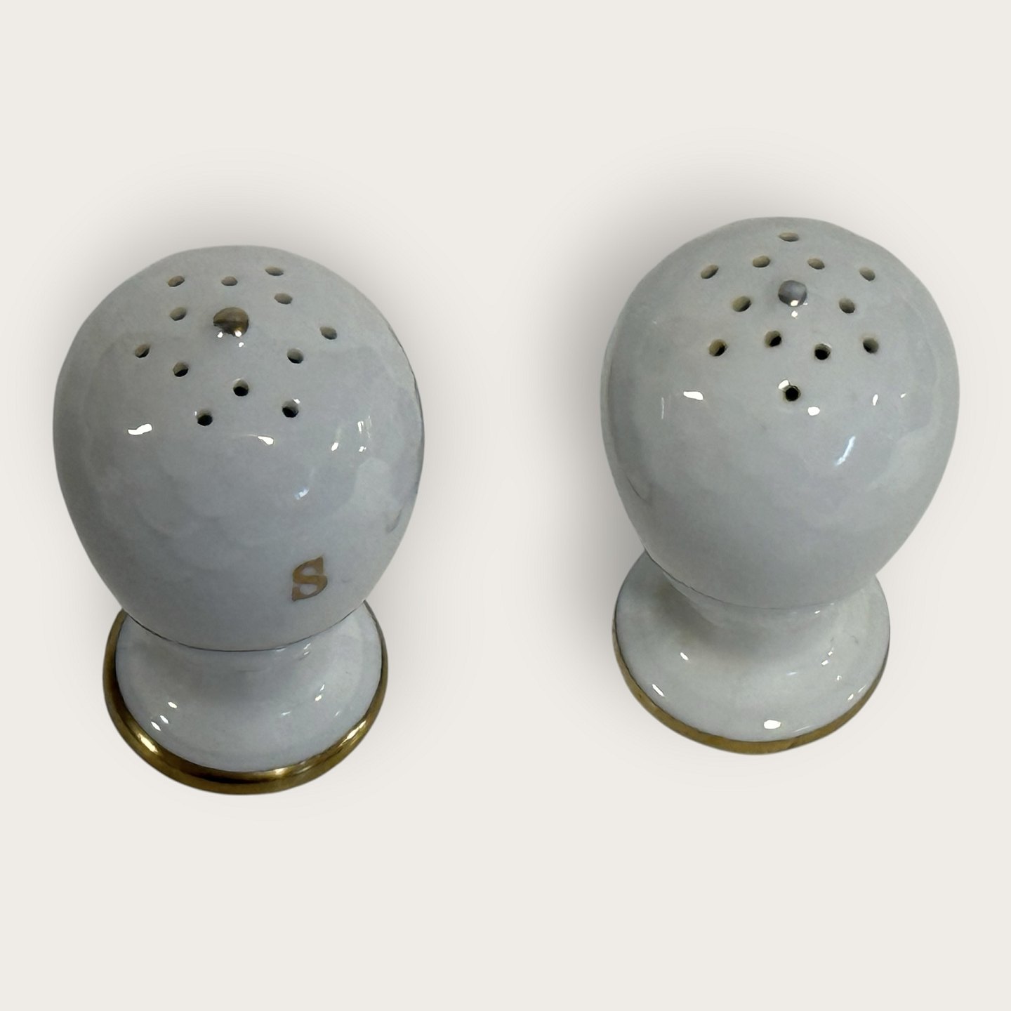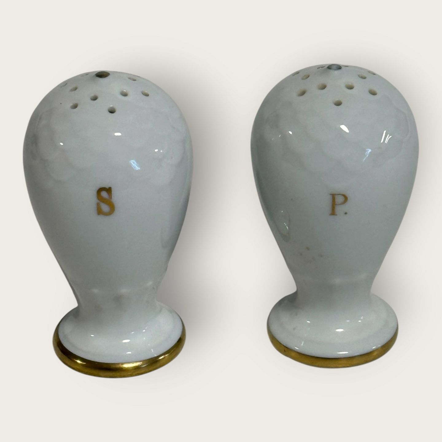 | Bing & Grondahl, Aakjær, Weißes Porzellan mit Goldrand, Salz- und Pfefferstreuer, 7 cm hoch, 1. Wahl *Guter Zustand*