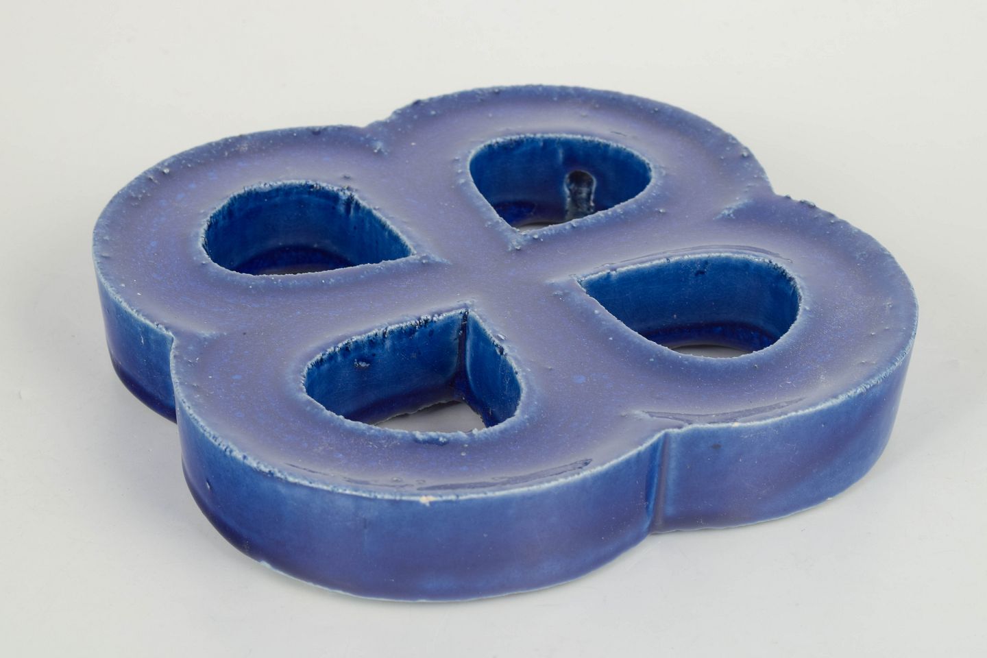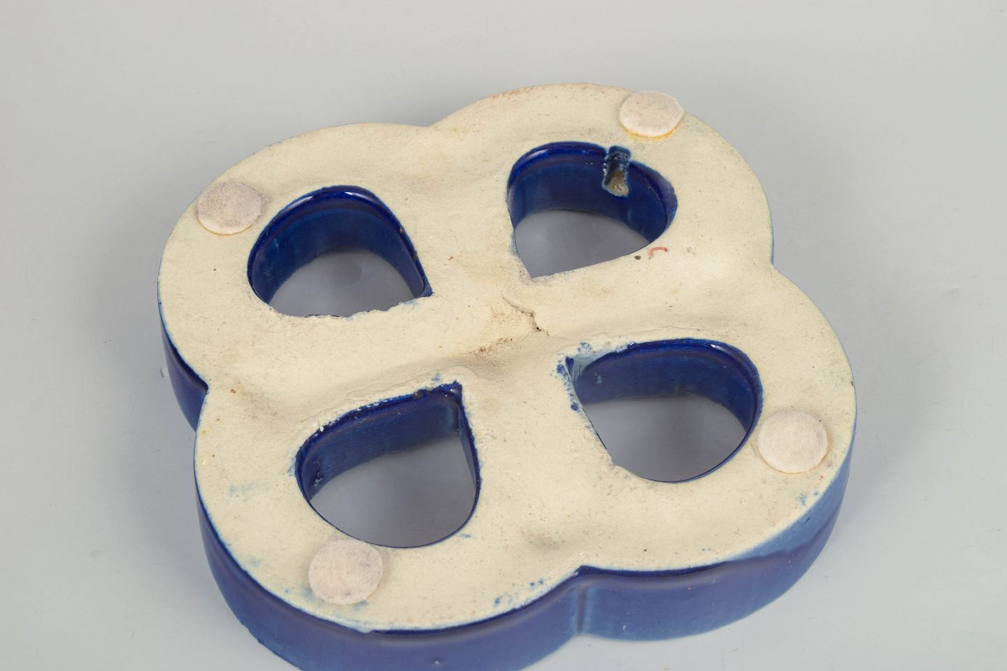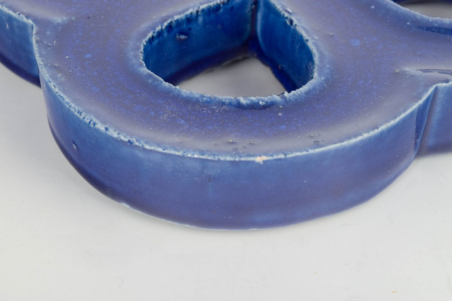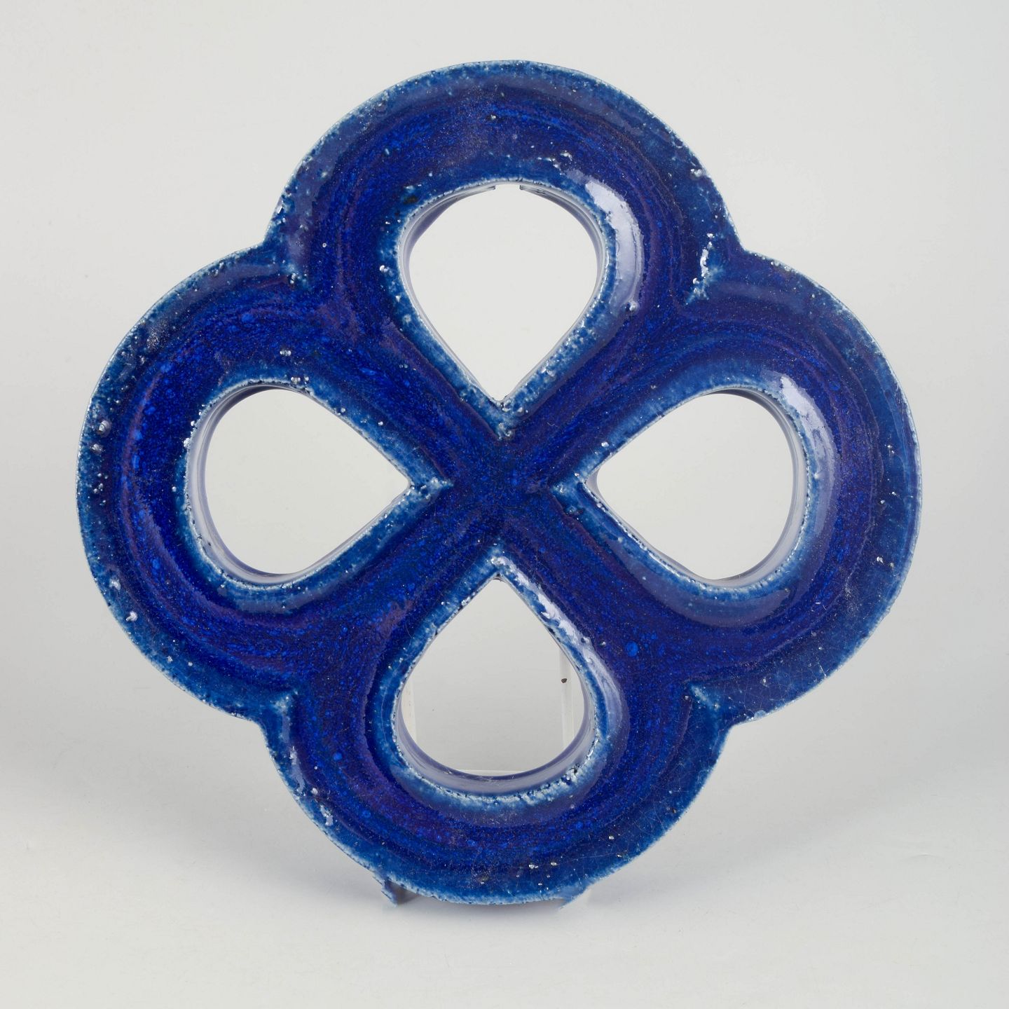 Dekorativt vægrelief i stentøj med organisk firkløverform og gennemgående åbninger. Udført med dyb blå, levende glasur med bobleeffekt og variation i overfladen. Bagside med hul til ophæng.
