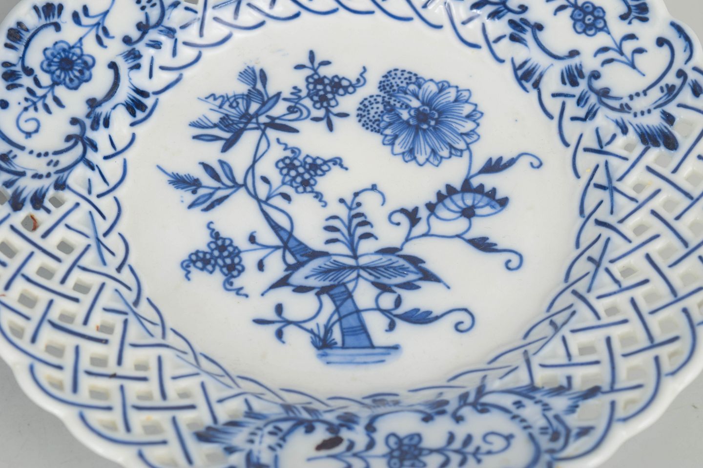 Klassiske salattallerkener i porcelæn med gennembrudt fane og blå løgmønstret dekoration i underglasur. Traditionelt håndmalet udtryk med fin detaljering.