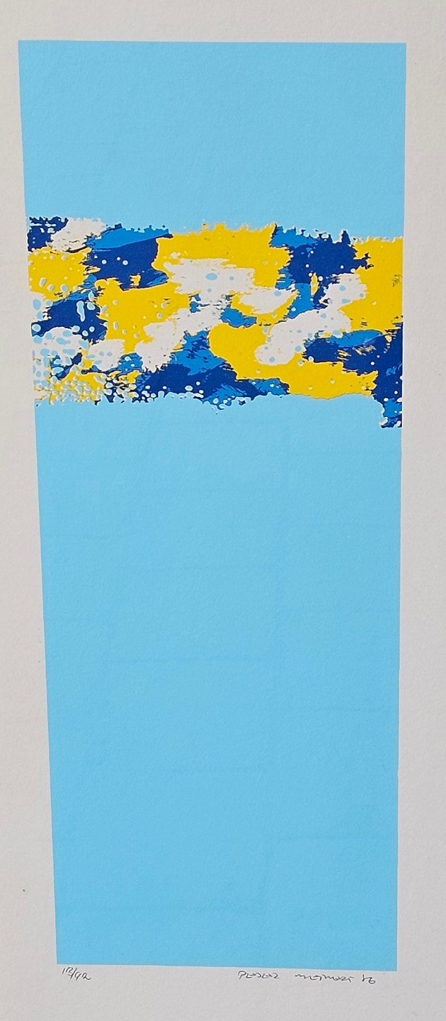 Litografi med blå, hvide og gule farver på lyseblå baggrund i metal ramme. 13/92