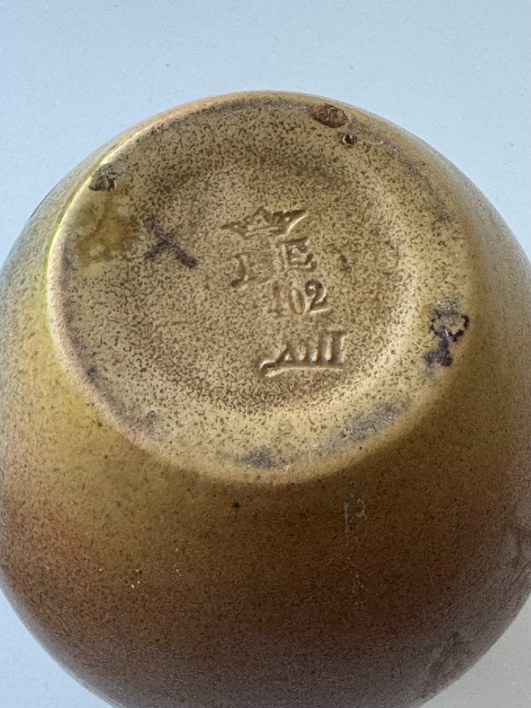 SKØNVIRKESTIL: Vase i keramik fra P. Ipsens Enke. Fremstår i god stand uden skader eller reparationer. Fabriksmærket på bunden med det velkendte logo “Krone over PIE” samt modelnummer 402. Højde: 12,5 cm
