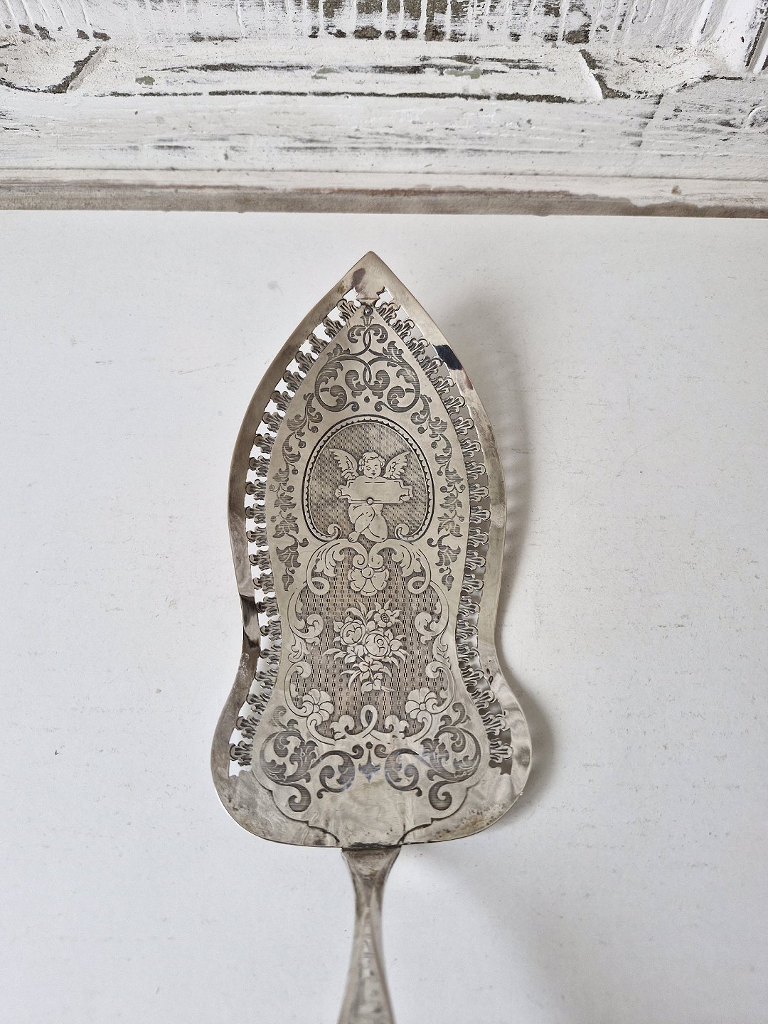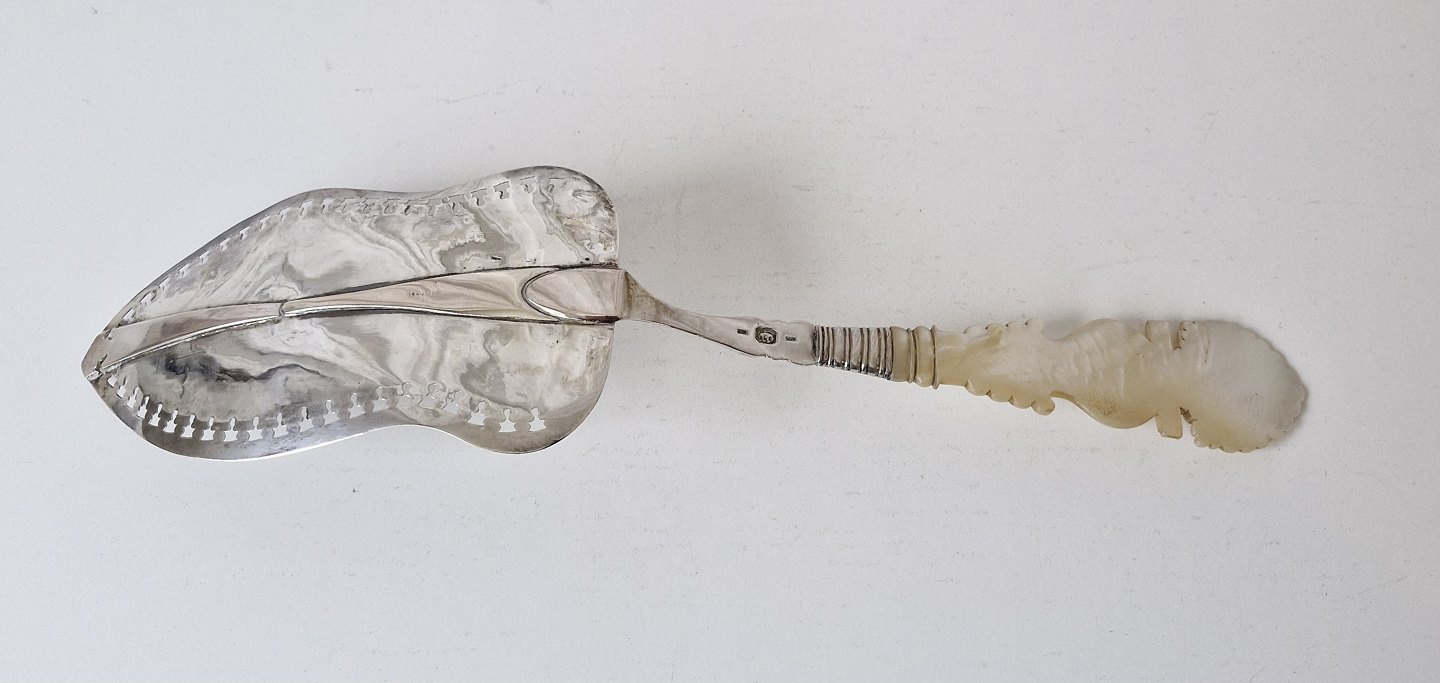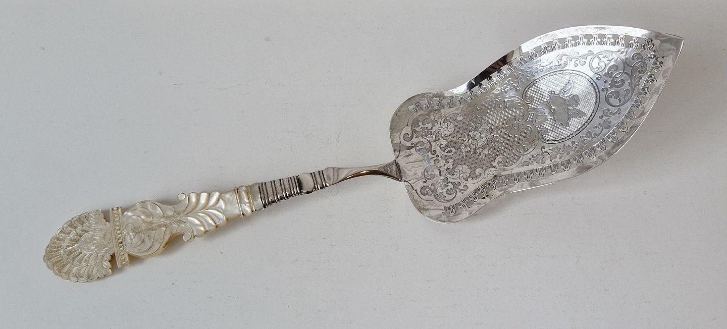 Text zugänglich auf Dänische: Stor fiskespade i sølv med perlemors håndtag. Sølv laf med gennembrudt kant, smukt dekoreret med en engel og blomster. Perlemors håndtaget er smukt udskåret med en påugl.