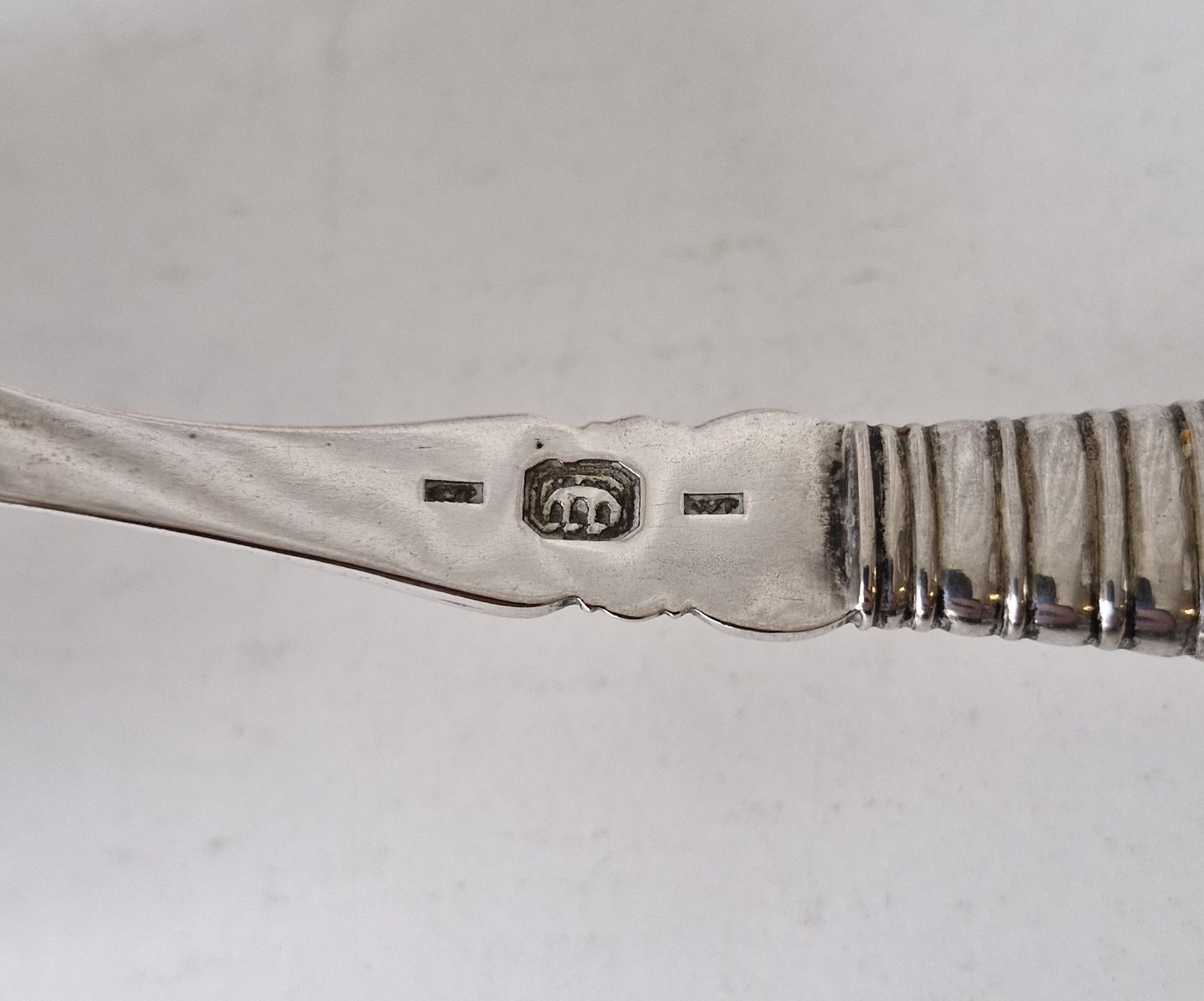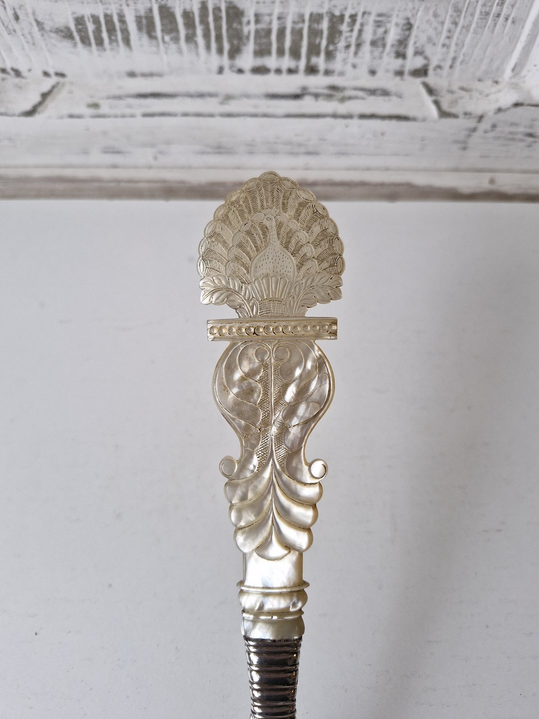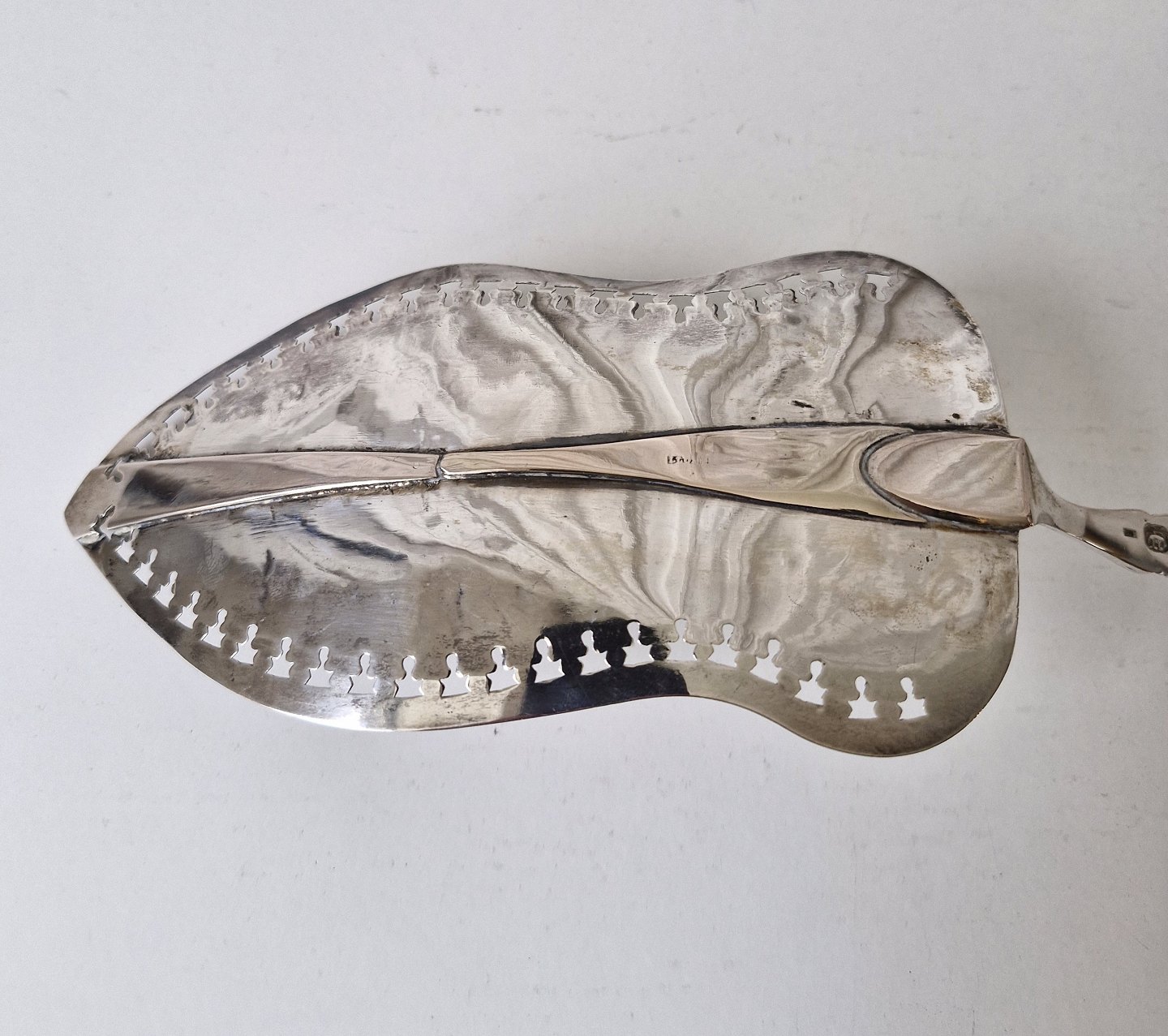 Text zugänglich auf Dänische: Stor fiskespade i sølv med perlemors håndtag. Sølv laf med gennembrudt kant, smukt dekoreret med en engel og blomster. Perlemors håndtaget er smukt udskåret med en påugl.