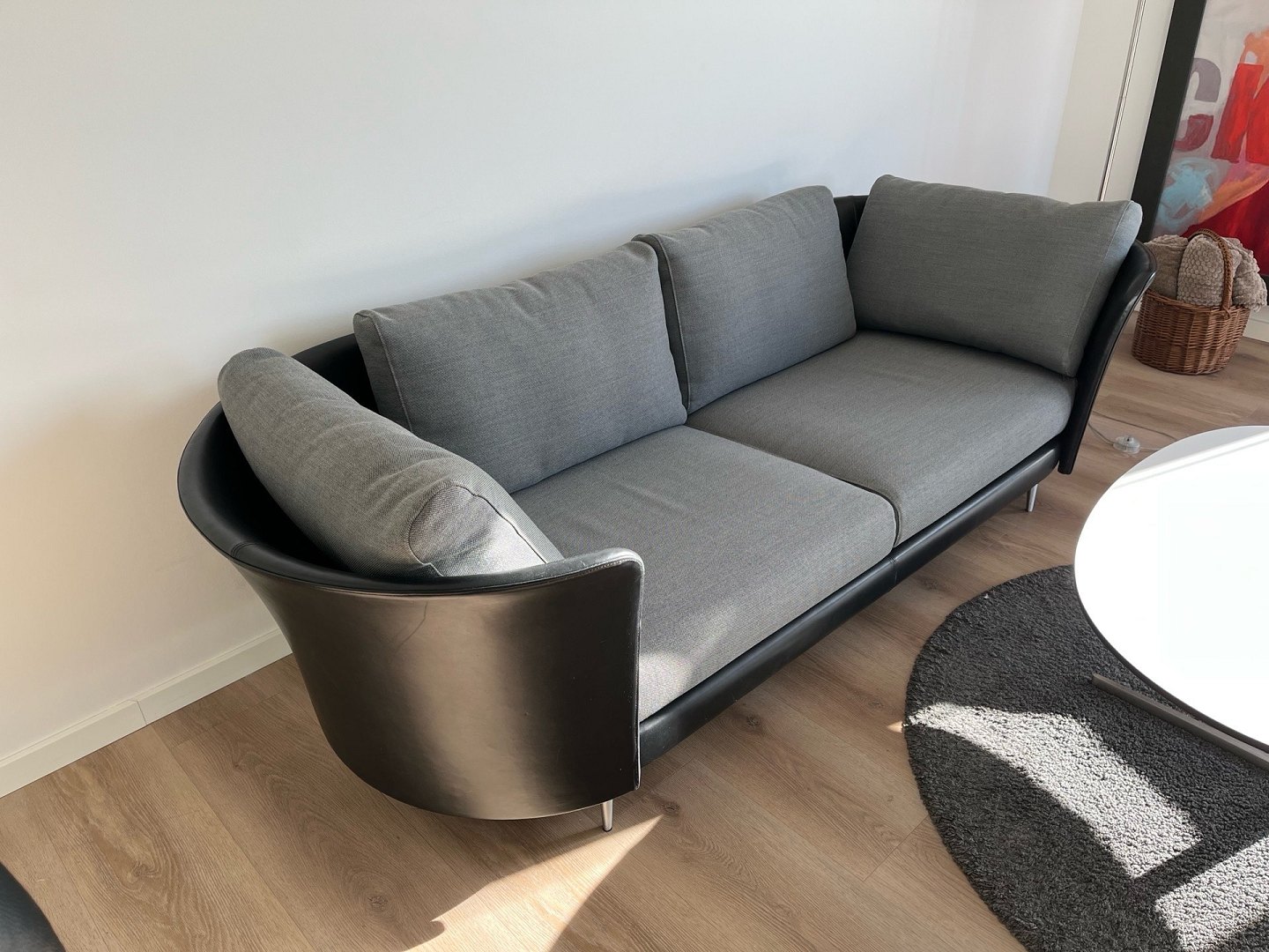 Exklusives Mogens Hansen Vascas Sofa in schwarzem Preston-Leder und Hallingdal-Stoff. Originalpreis: 51.975,-. Dieses exklusive Vascas Sofa von Mogens Hansen besticht durch sein hervorragendes Design und kombiniert schwarzes Preston-Leder mit hochwertigem Hallingdal-Stoff. Das Sofa ist mit eleganten Spike-Fußleisten ausgestattet. Die Beine in matter Ausführung unterstreichen das stilvolle Design. Die Uhr wurde im März 2020 geboren und hatte nur einen Besitzer. Sie stammt aus einem Nichtraucherhaushalt ohne Haustiere und Kinder und wurde nur wenig täglich im Wohnzimmer benutzt. Der Riemen ist daher nahezu neuwertig und in einem sehr guten Zustand. Das Design zeichnet sich durch eine eng geschwungene Außenschale aus, die einen schönen Kontrast zum weichen, bequemen Stoff bildet. Das Modell Vascas kombiniert Leder und Stoff an Gestell und Kissen und unterstreicht so den charakteristischen Ausdruck des Sofas. Es entsteht ein elegantes Zusammenspiel zwischen dem straffen Äußeren und dem einladenden Inneren