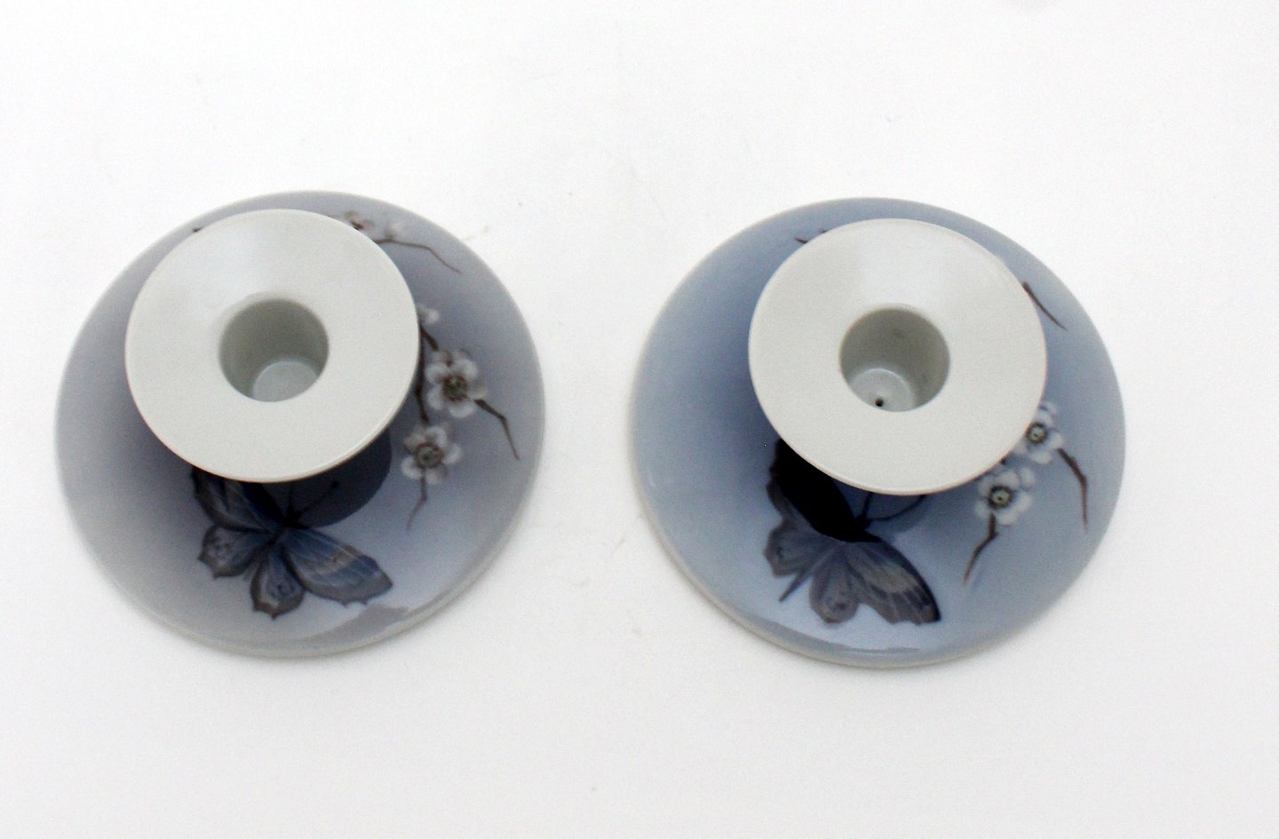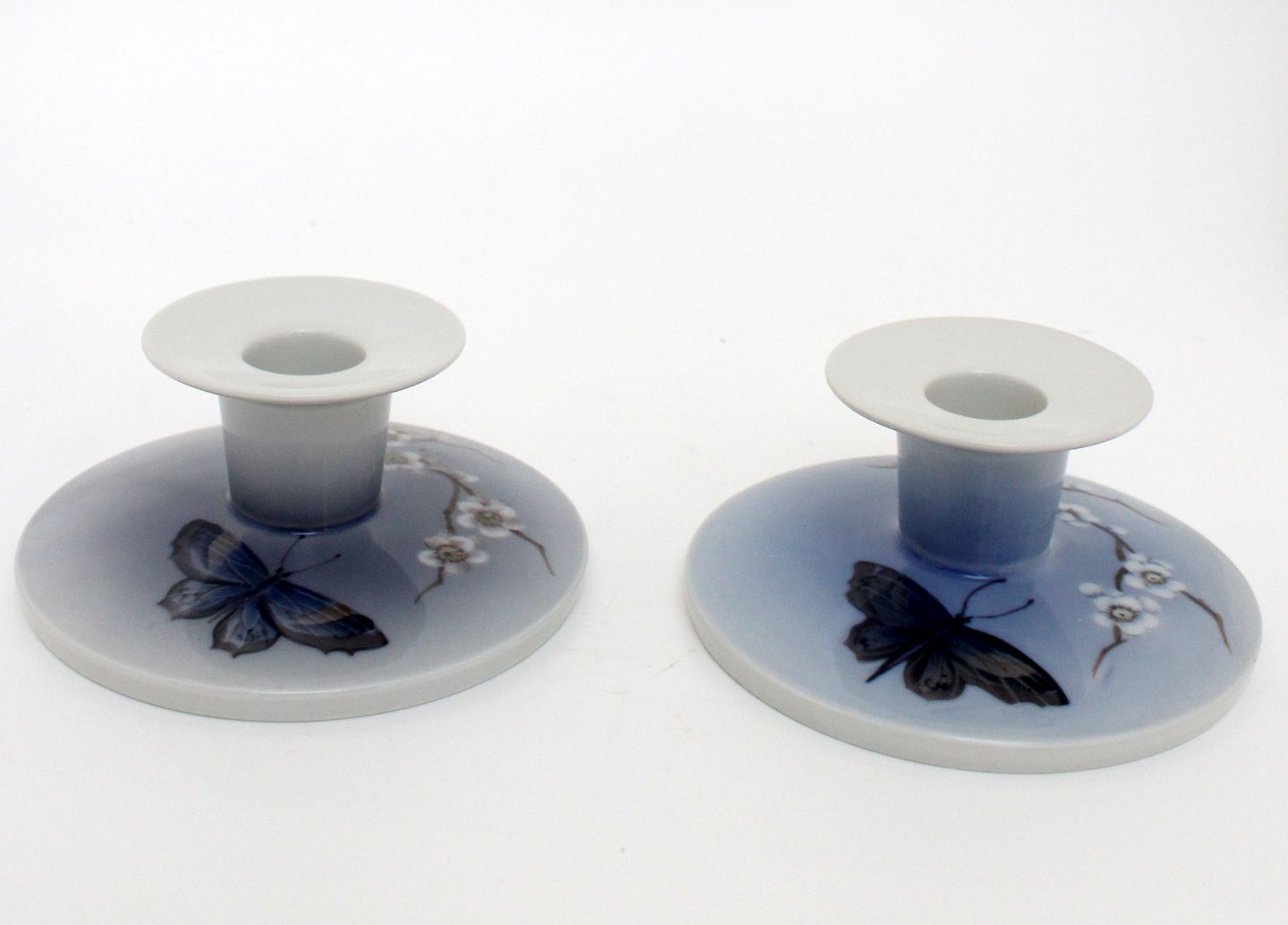 Text zugänglich auf Dänische: Royal Copenhagen, Lysestager med blomstergren og sommerfugl i lyseblå porcelæn. Nr. 2301/3335. Diameter 12 cm. Højde 5,5 cm. I. sortering. Der er lidt farveforskel i den blå farve. Pris: 250 kr. stk. Lager: 2