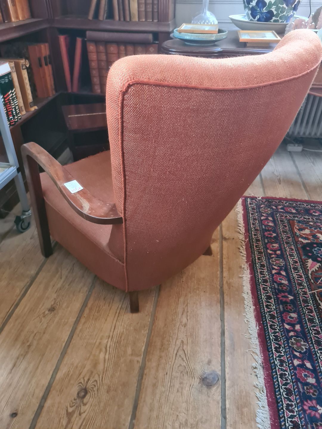 Text zugänglich auf Dänische: Snedkermester lænestol fra 1960'erne i Cuba mahogni med stofbetrukket ryg og sæde. Fremstår god og stabil men med lettere brugsspor på især venstre armlæn og sæde. (Billede)
