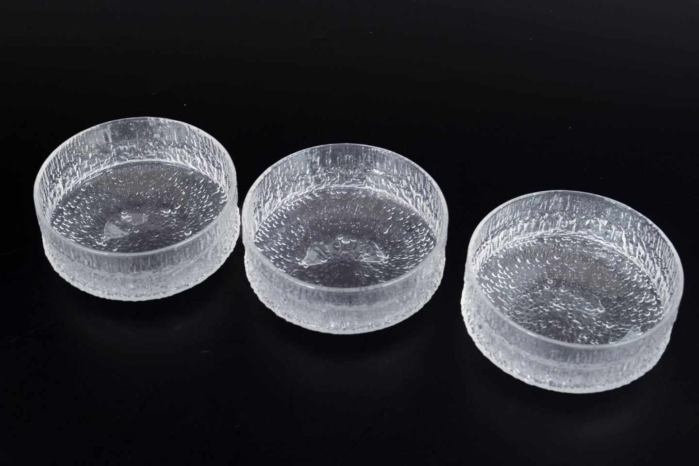 Sæt af tre mindre skåle i presset glas med karakteristisk organisk struktur og fint cirkulært reliefmønster. Designet skaber et smukt lysspil i glasset og er et klassisk eksempel på finsk glasdesign. Model Hopla i klart glas.