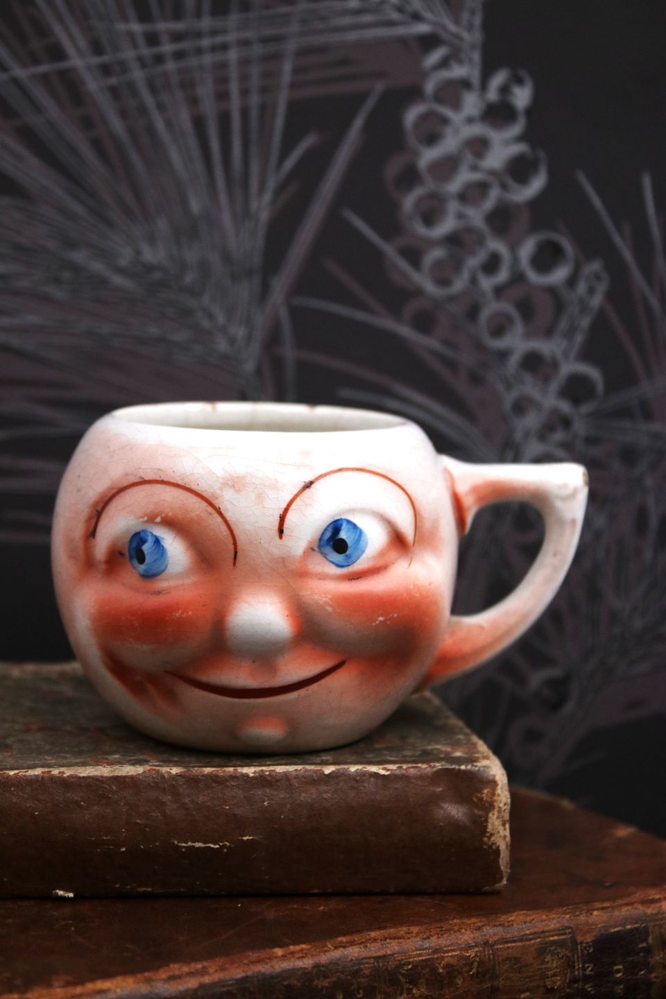 Gamle fajance kopper med hank og sjove ansigter fra omkring år 1930.