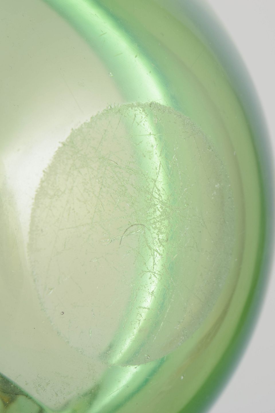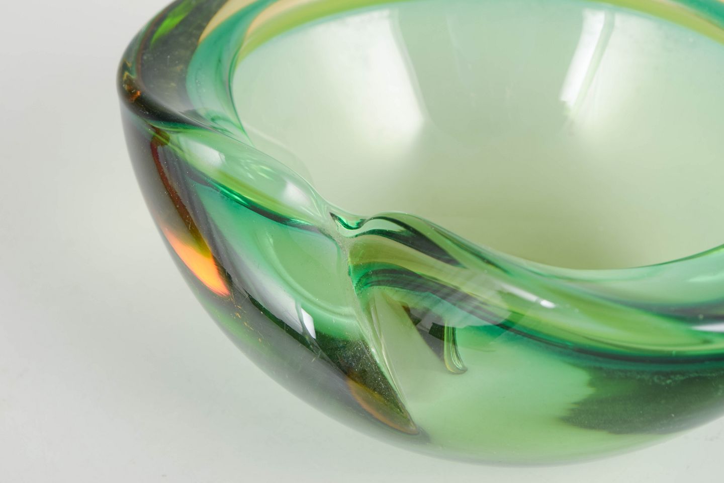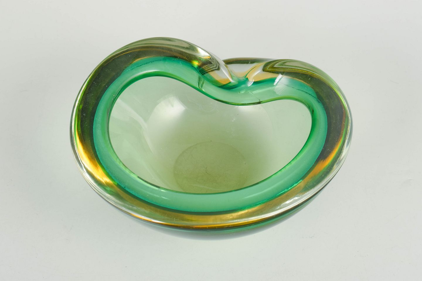 Organisk formet skål i mundblæst glas med bløde, afrundede linjer og transparent grøn farve med indlejrede nuancer i klart og gyldent glas.