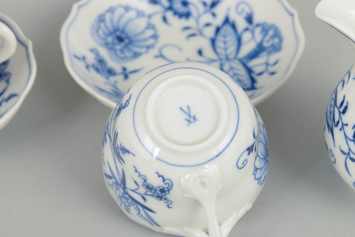 Text zugänglich auf Dänische: Meissen løgmønster, sæt af to espressokopper med underkopper samt flødekande.