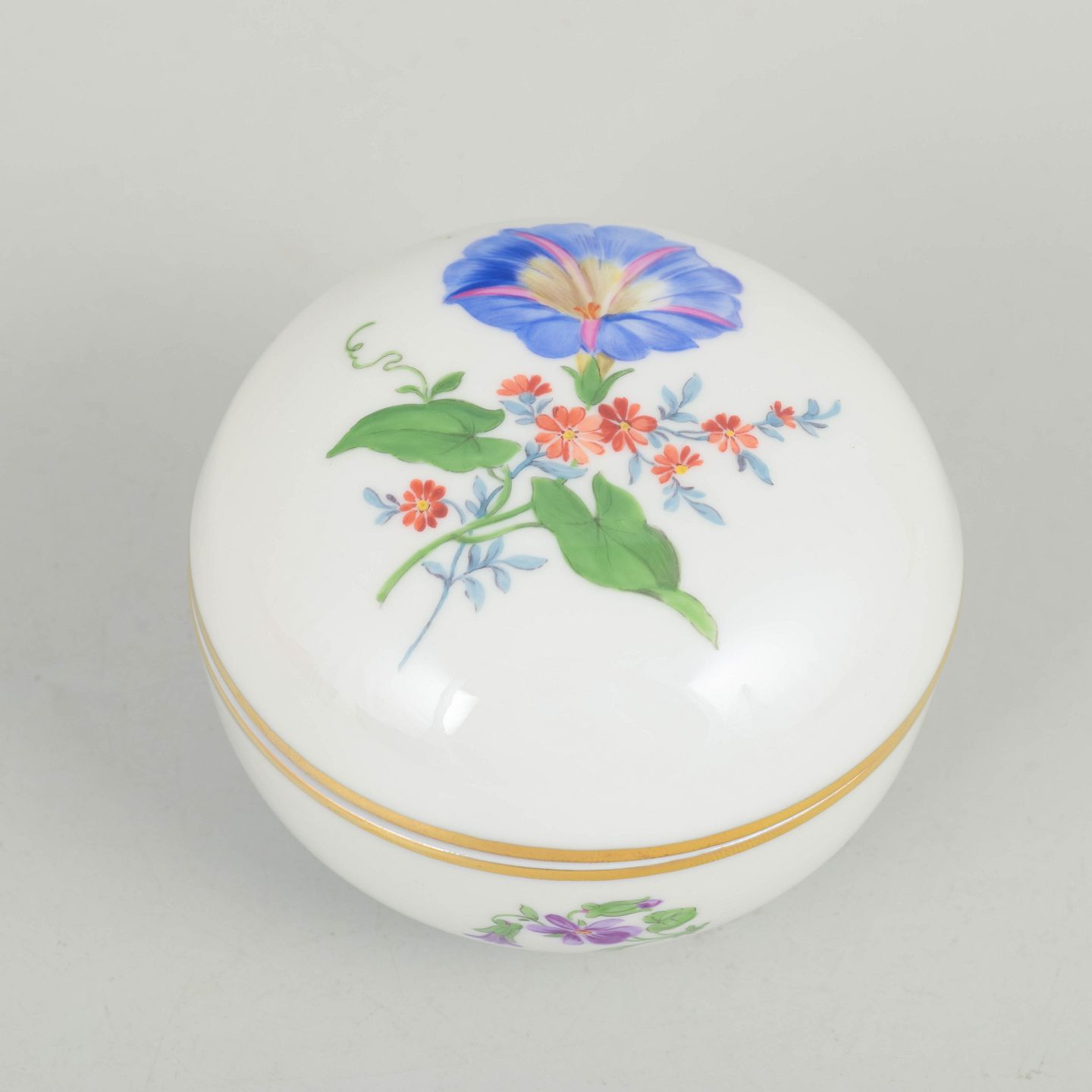 Rund lågkrukke i porcelæn håndmalet med polykrome blomster og dekoreret med guldkant. Klassisk Meissen udførelse fra midten af det 20. århundrede med fint afstemt låg og elegant, enkel form. Undersiden mærket med Meissen krydssværd. 3. sortering.