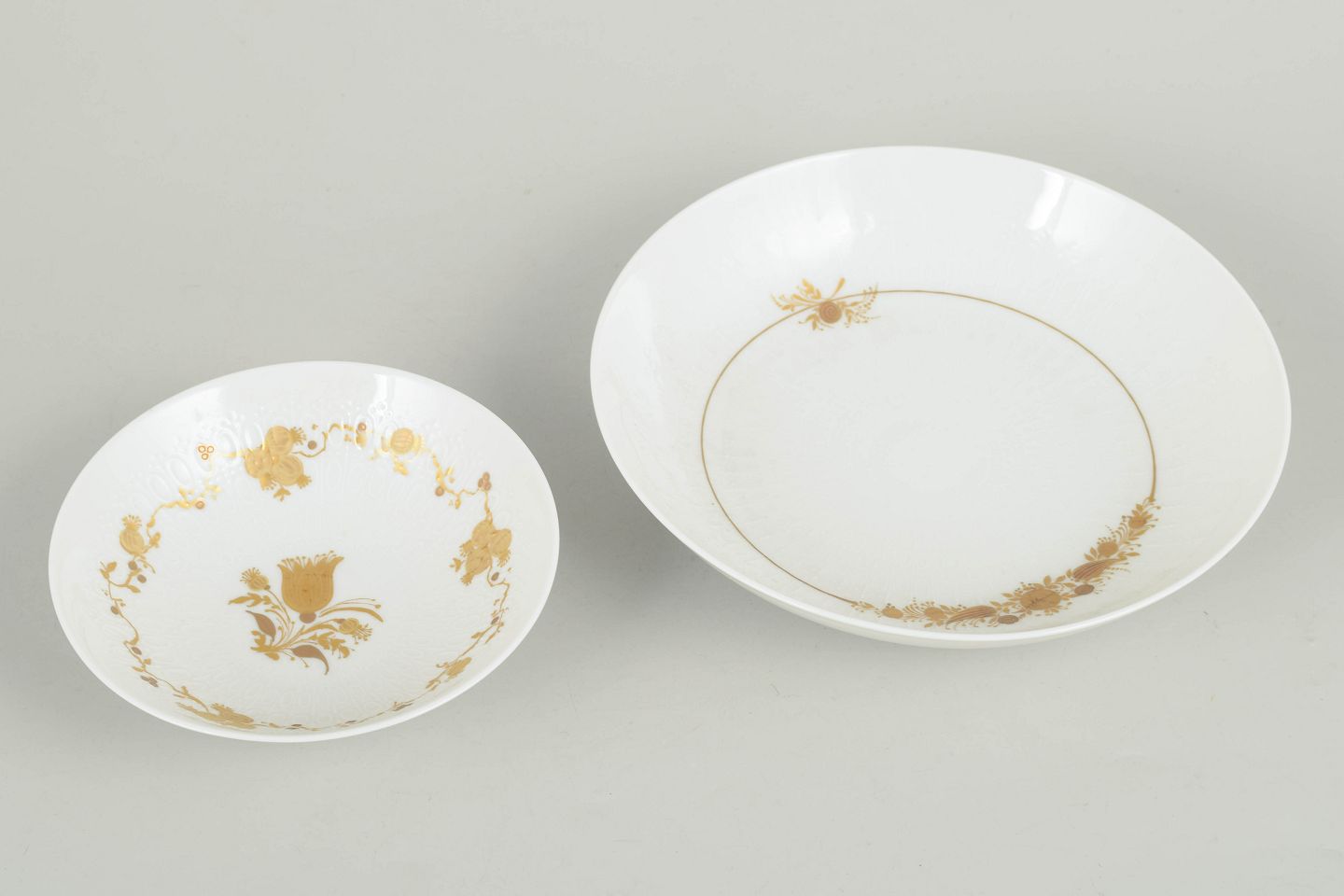 Sæt bestående af to skåle i porcelæn dekoreret med det karakteristiske blomsterornament fra Romanze-serien. Dekorationen fremstår i gyldne nuancer med fine detaljer og et elegant, romantisk udtryk, typisk for Wiinblads formsprog i 1970’erne.