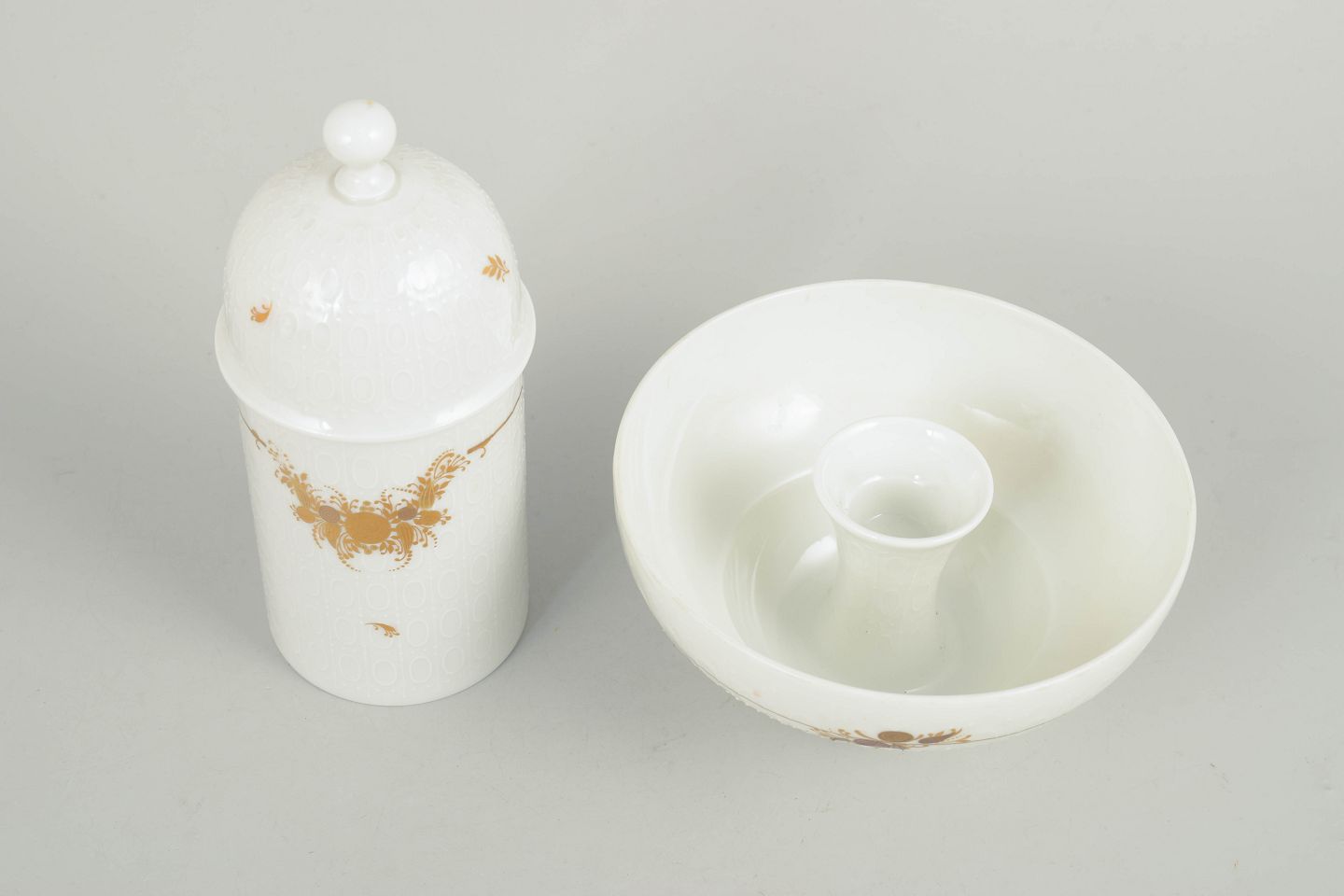 Sjældent sæt bestående af lysestage og tedåse med låg i porcelæn, dekoreret med det karakteristiske romantiske blomsterornament fra Romanze-serien. Elegant formsprog med fine gulddetaljer, typisk for Wiinblads dekorative univers i 1970’erne.
