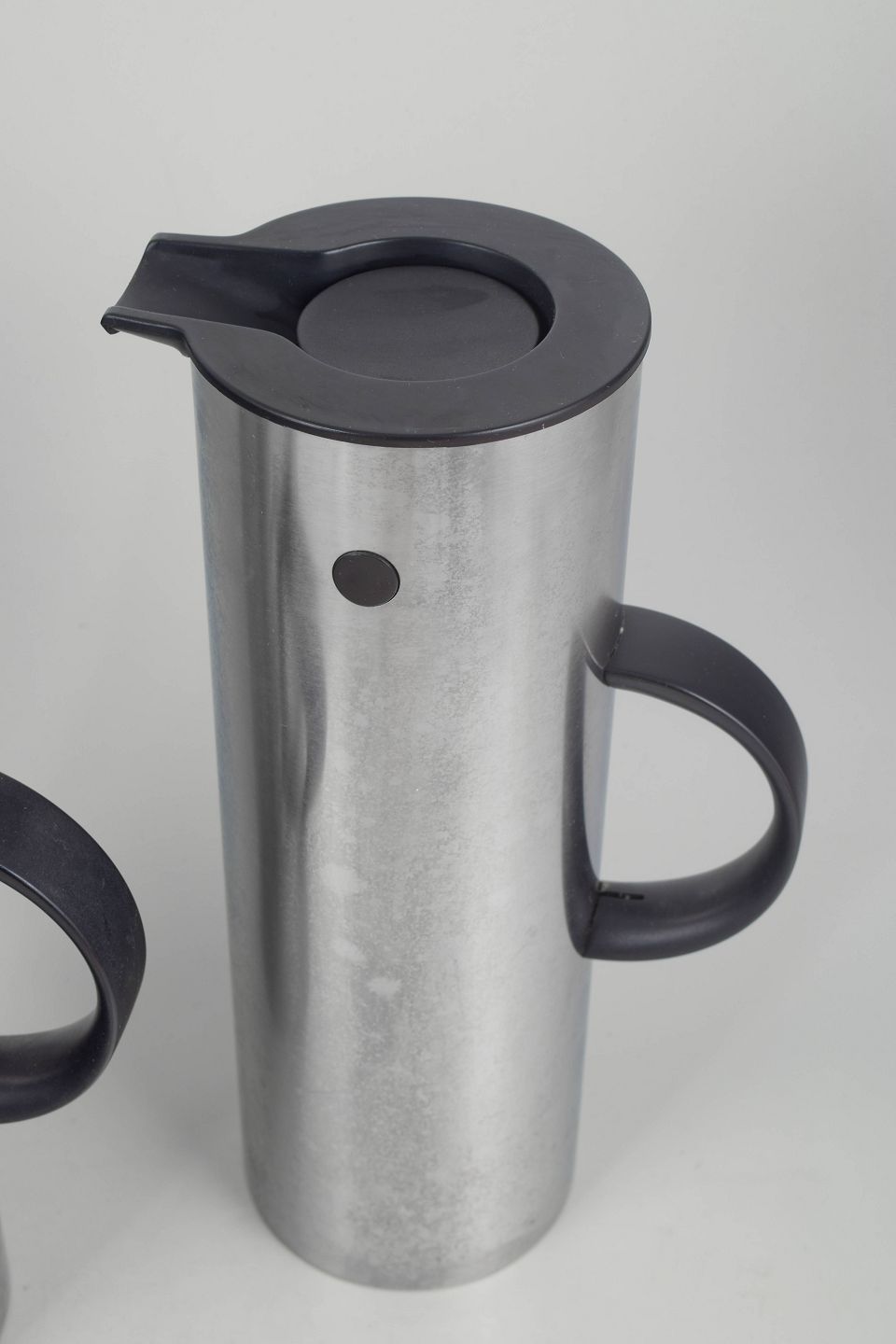 To cylindriske termokander i børstet rustfrit stål med karakteristisk vippeprop og sort kunststofhank. Model fra Steltons ikoniske serie, designet med fokus på funktionalitet og minimalistisk formgivning.