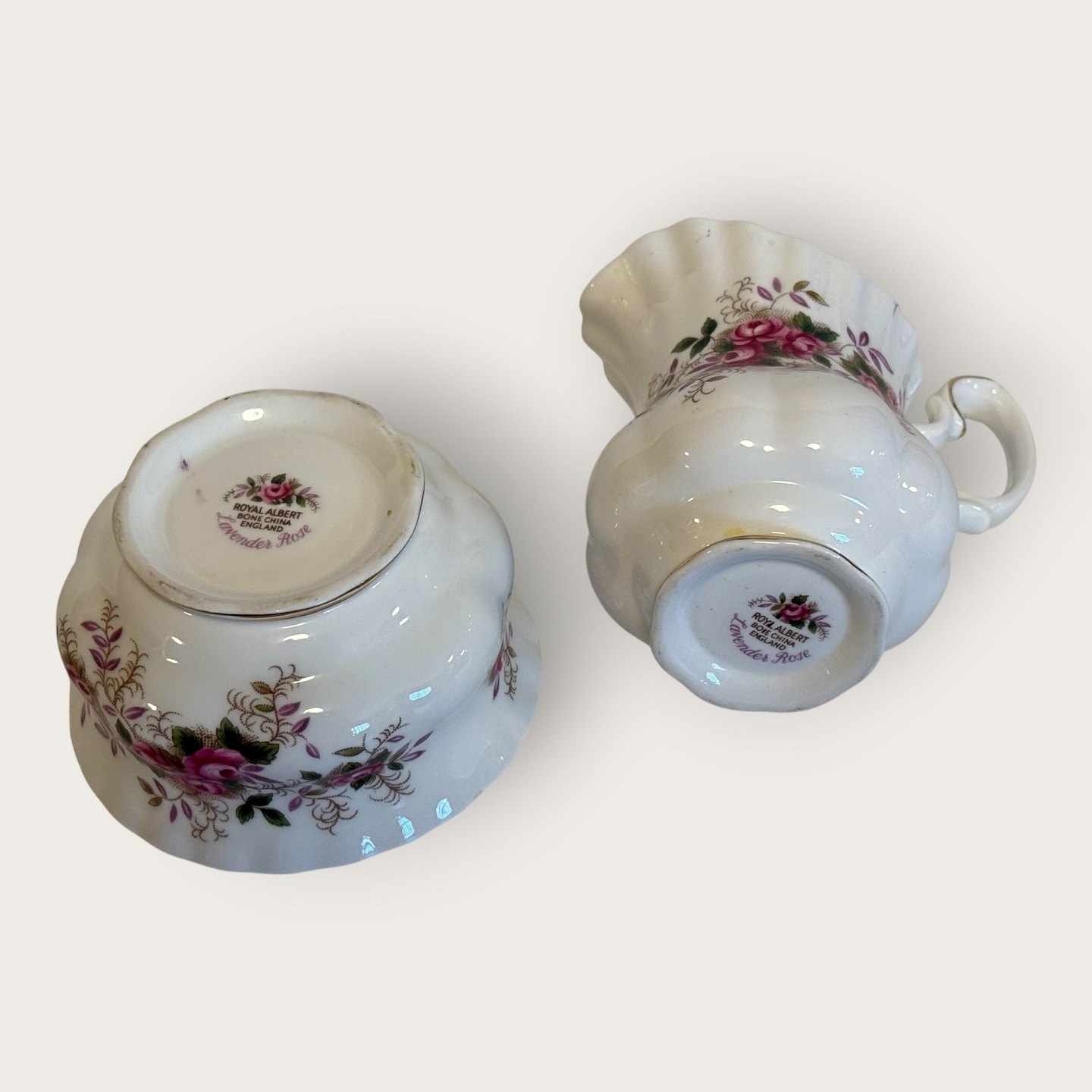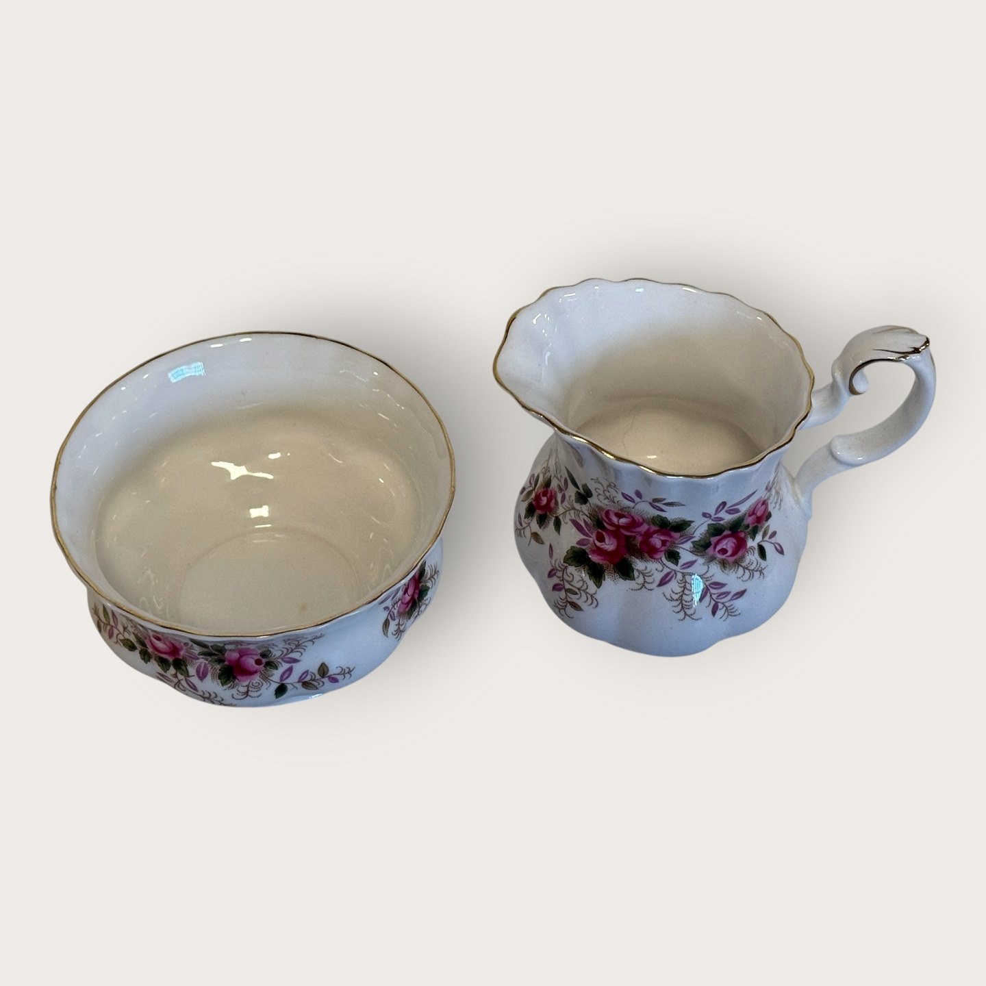 Royal Albert, Bone China, Lavendelrose, Zucker- und Sahneservice, Zuckerdose Höhe 5,5 cm, Durchmesser 9,5 cm, Sahnekännchen ca. H x B x T 9 x 10 x 7 cm *Perfekter Zustand*