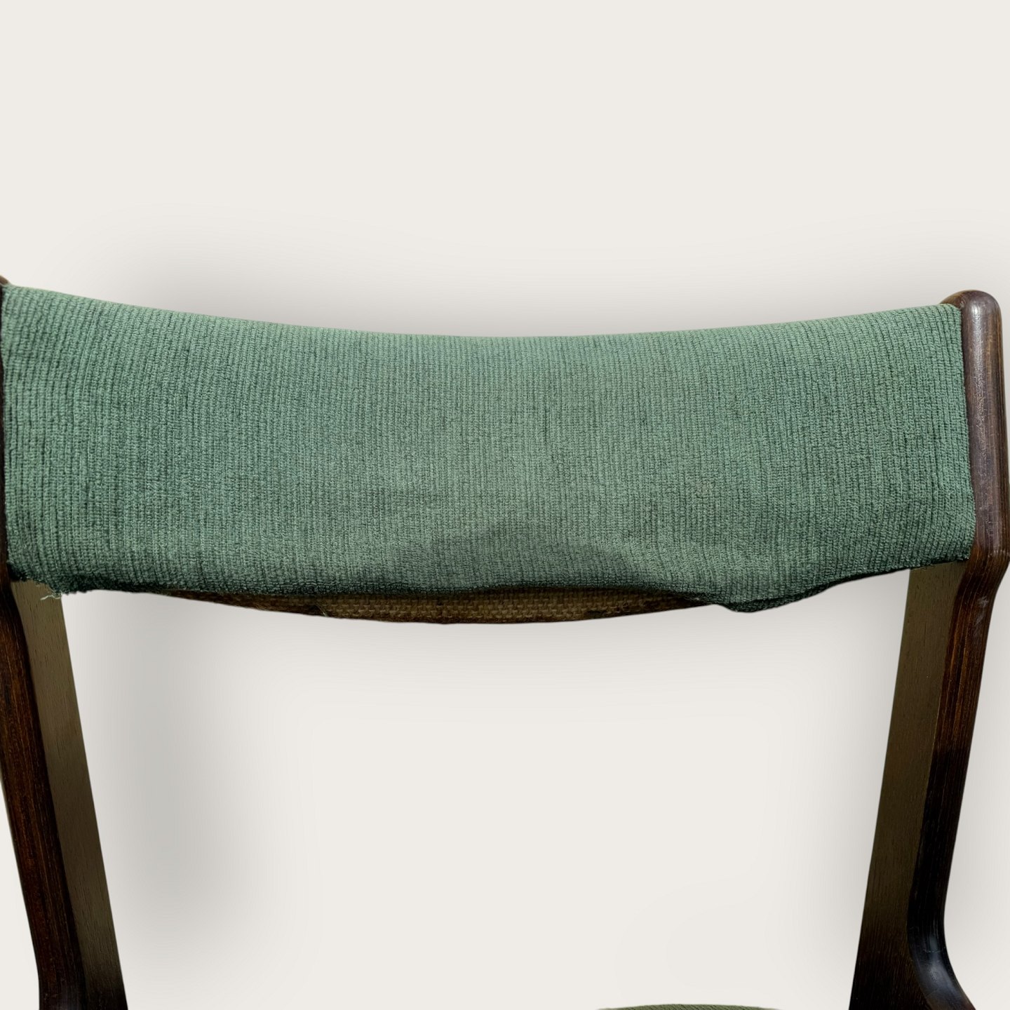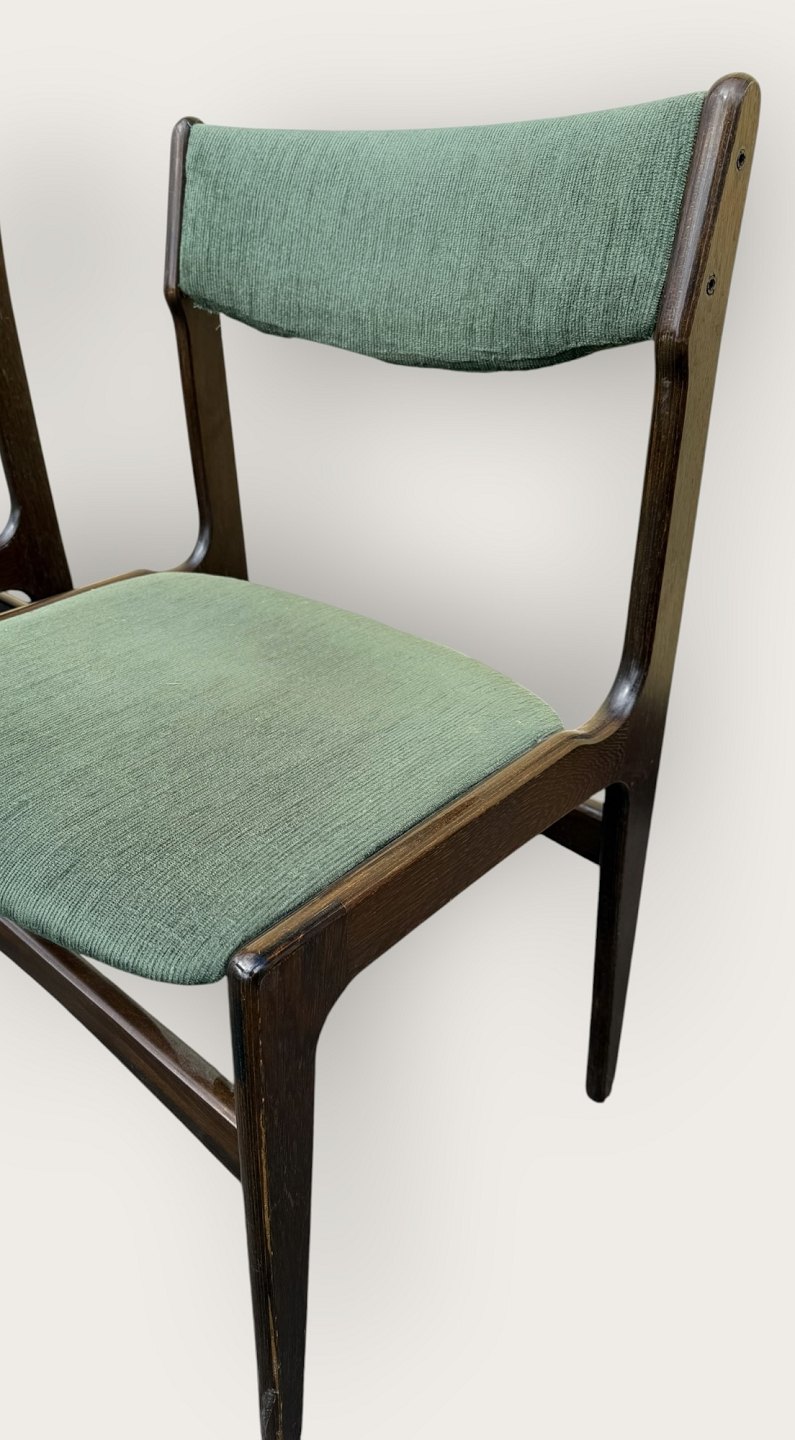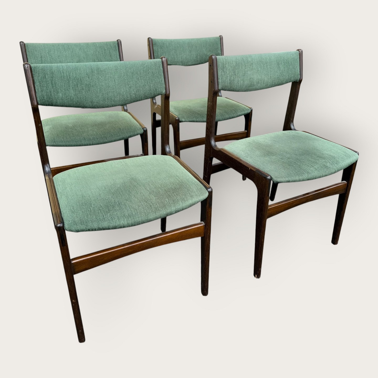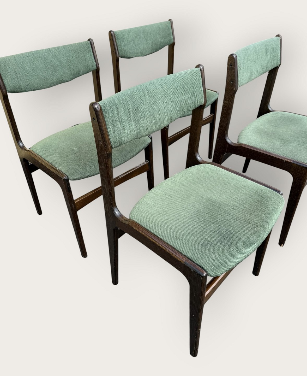 4 Stühle aus dunkel gebeiztem Holz, dänisch modern aus den 1960er Jahren, die Stühle sind stabil und in gutem gebrauchten Zustand, aber der Bezug ist fleckig/locker.
