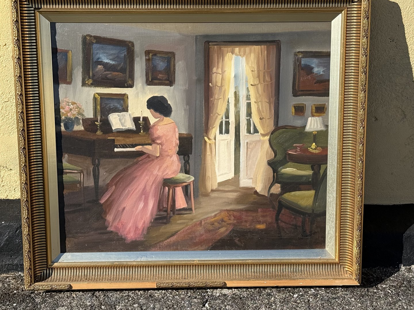 Frau im rosa Kleid am Klavier, Ölgemälde auf Leinwand, undeutlich signiert *hat einige Absplitterungen am Rahmen, ansonsten in gutem Zustand*
