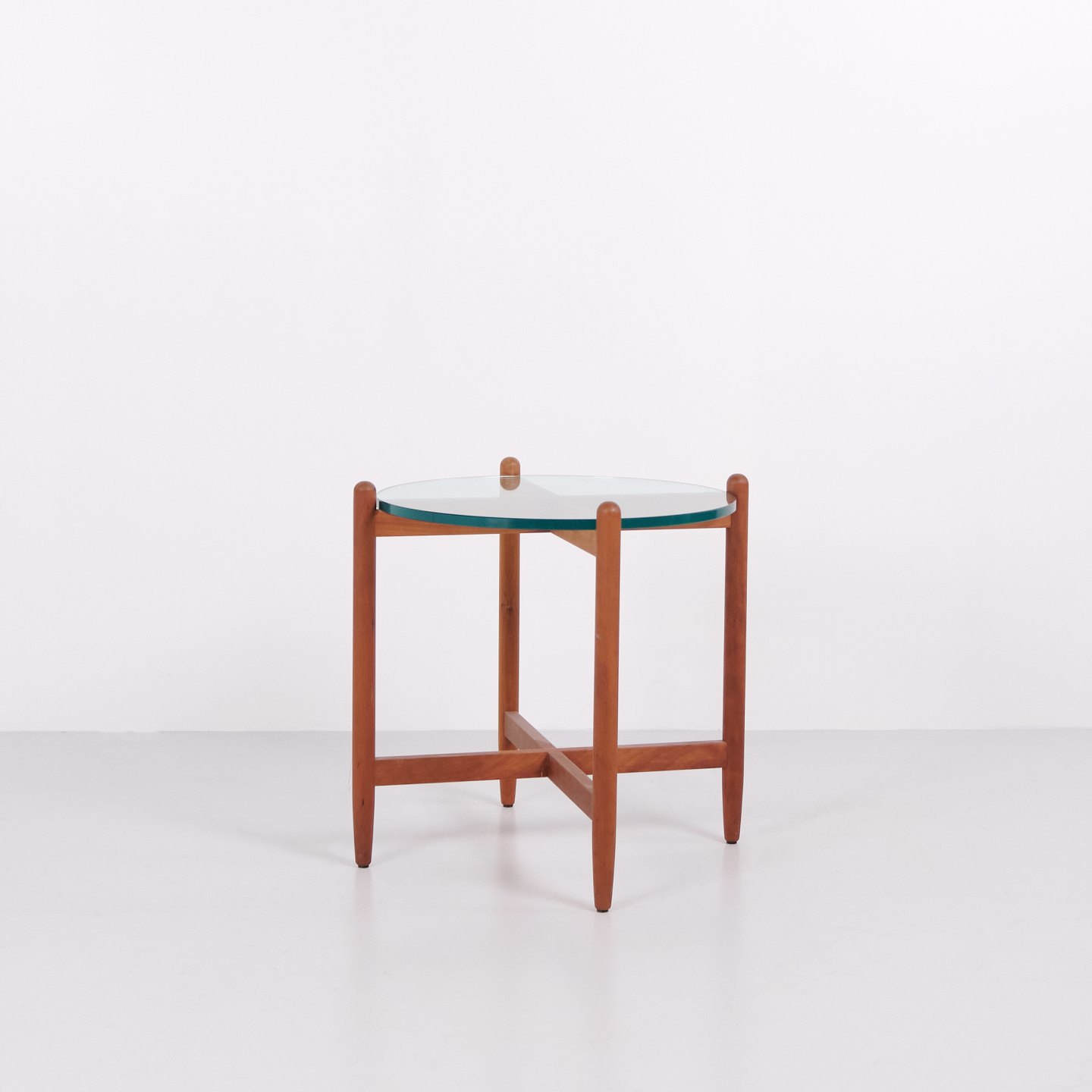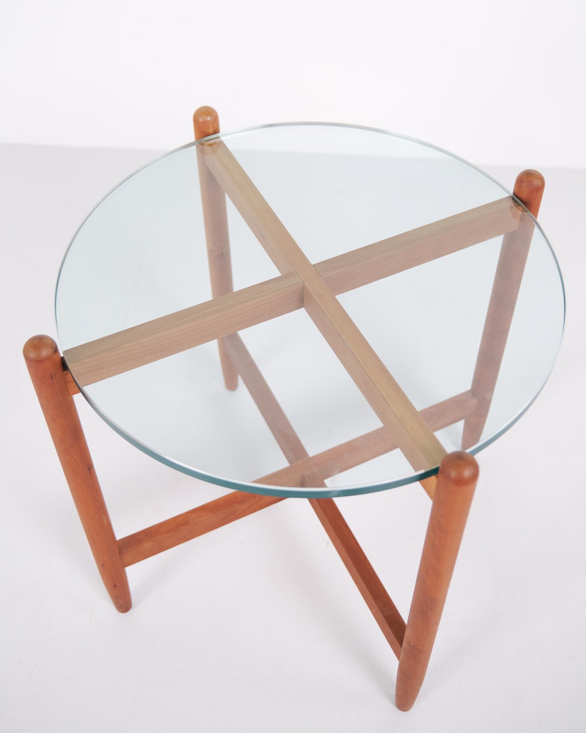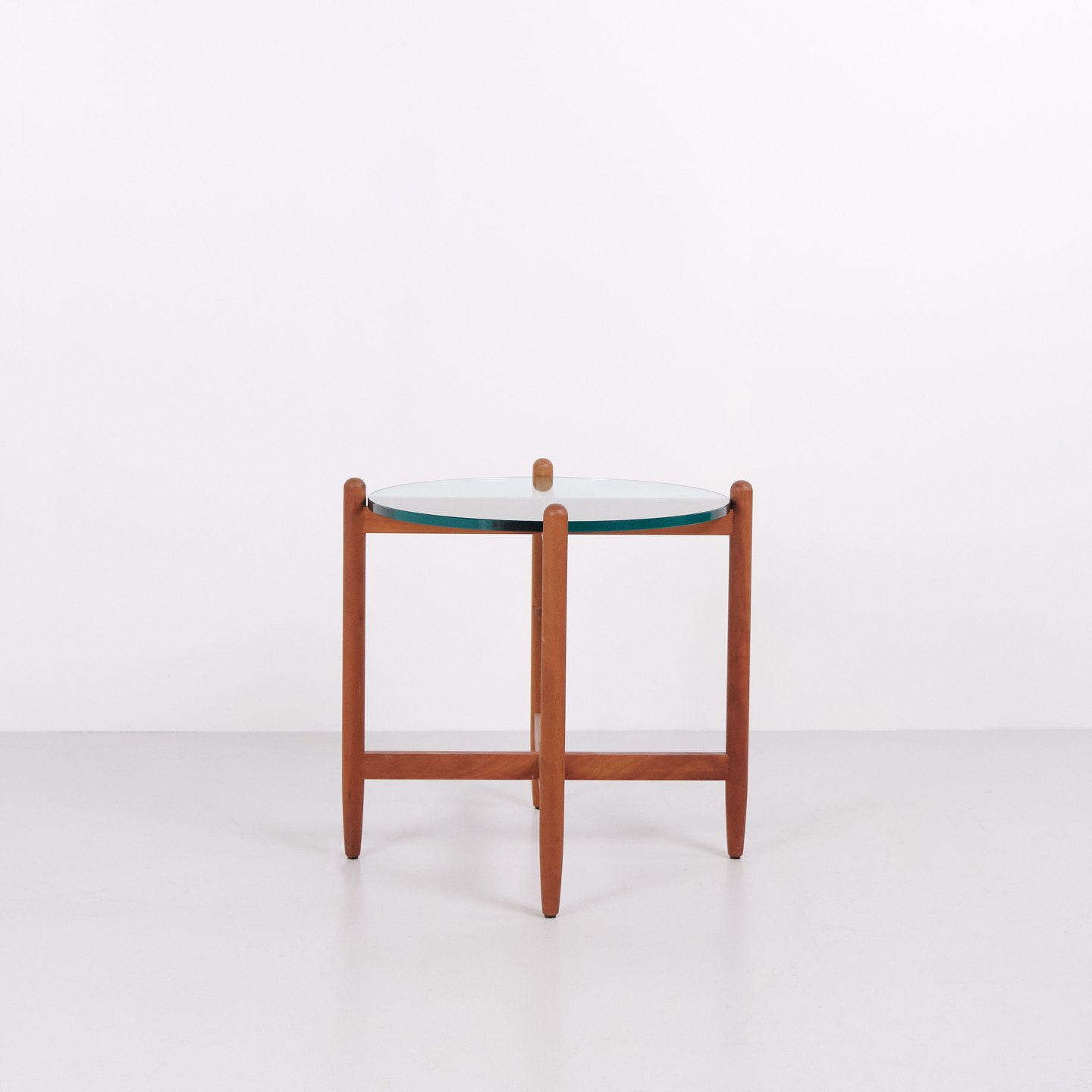 Schwedischer Beistelltisch aus den 1960er Jahren, gefertigt aus Kirschholz mit runder Glasplatte. Der Tisch verfügt über ein organisches Untergestell mit weich geschwungenen Beinen und hochwertiger Verarbeitung, inspiriert vom Designstil von Hans Johansson. Die Kombination aus massivem Holz und schwebender Glasplatte ist typisch für skandinavisches Design dieser Zeit. Geeignet als Lampentisch, Sofatisch oder Beistelltisch.