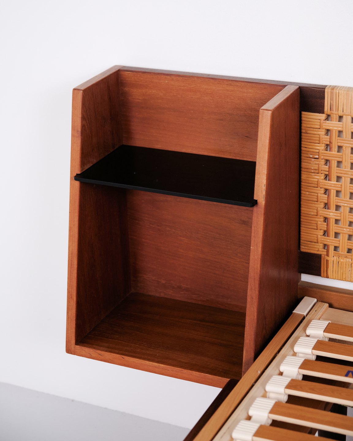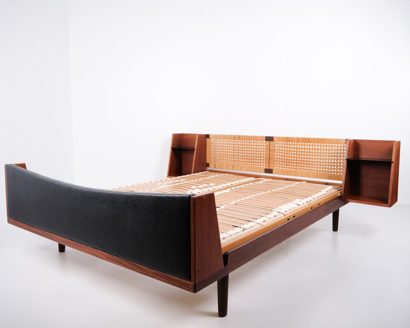 Doppelbett Modell GE 701, entworfen von Hans J. Wegner und hergestellt von Getama in den 1950er Jahren. Gefertigt aus furniertem und massivem Teakholz. Kopf- und Fußteil mit Geflecht und schwarzem Kunstleder. Kopfteil mit integrierten Nachttischen mit schwarzen Glasböden sowie zusätzlicher Ablage darunter. Messingbeschläge. Hans J. Wegner arbeitete viele Jahre mit Getama zusammen und entwarf mehrere Teakmöbel für Wohn- und Schlafbereiche.