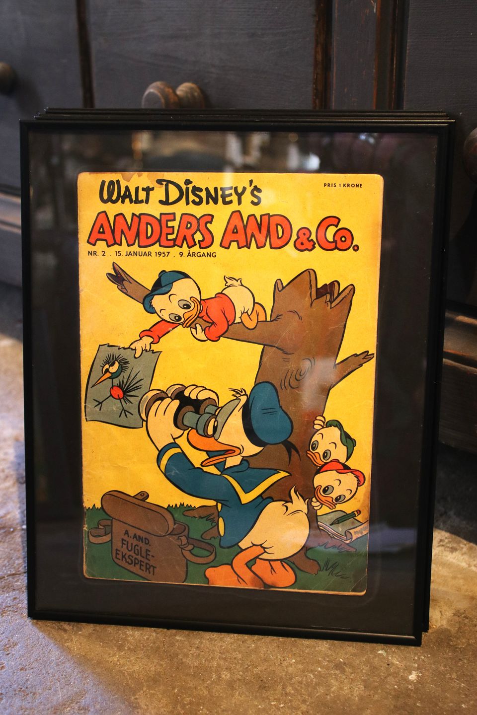 Dekorative , gamle Walt Disney Anders And blade fra årgang 1957 indrammet i sort ramme. 30x24cm...