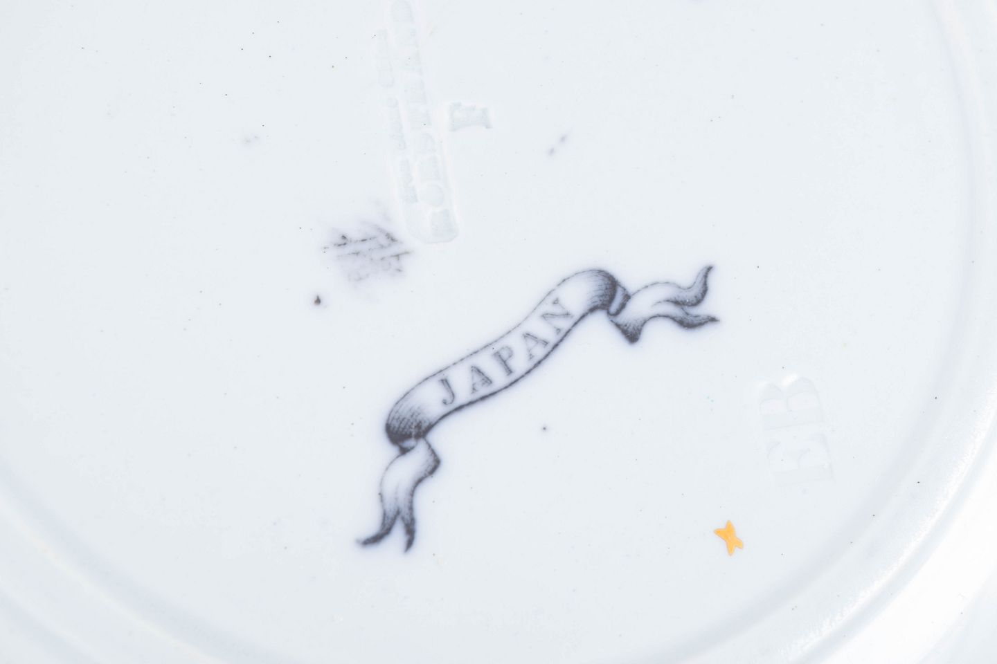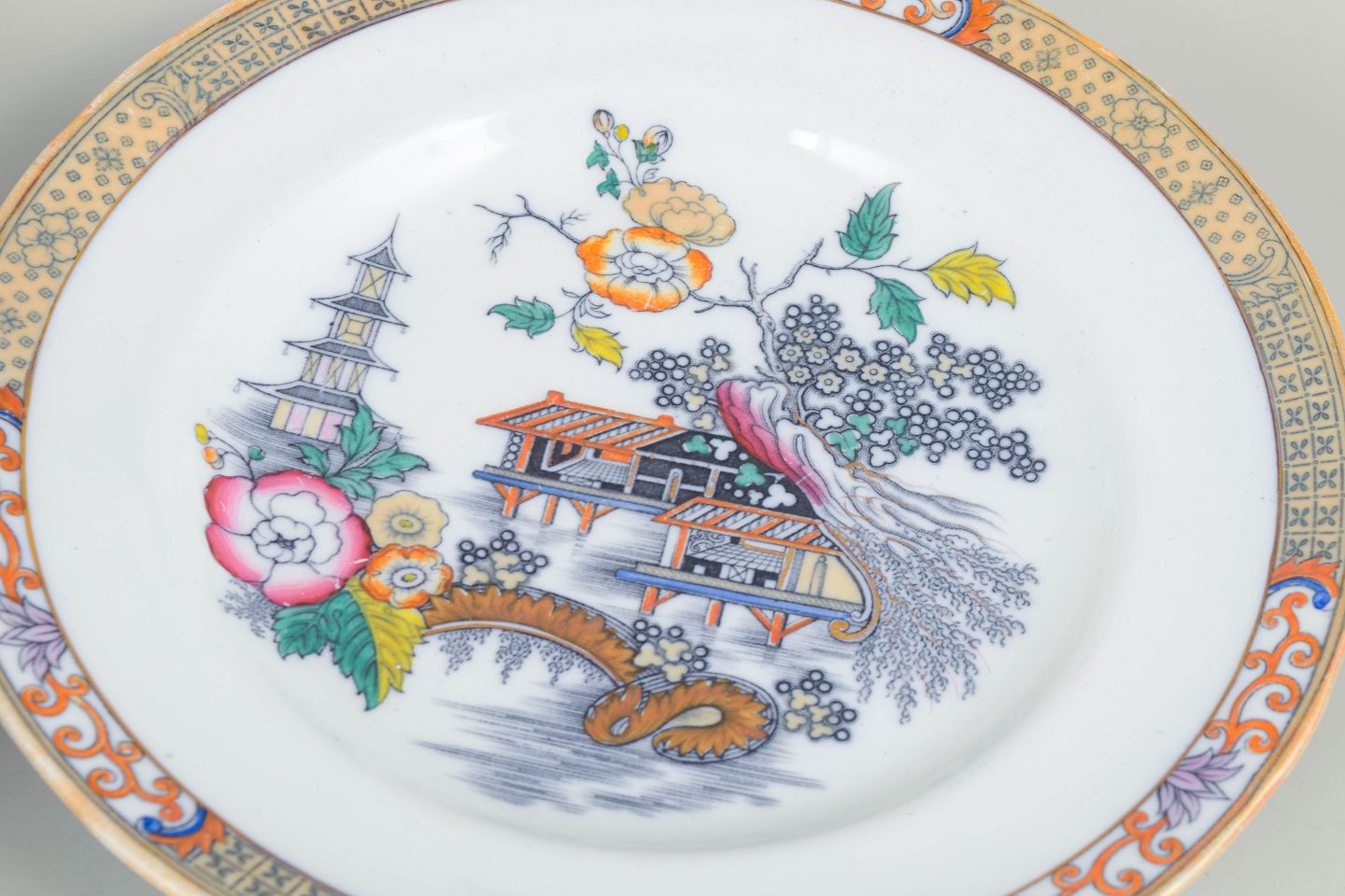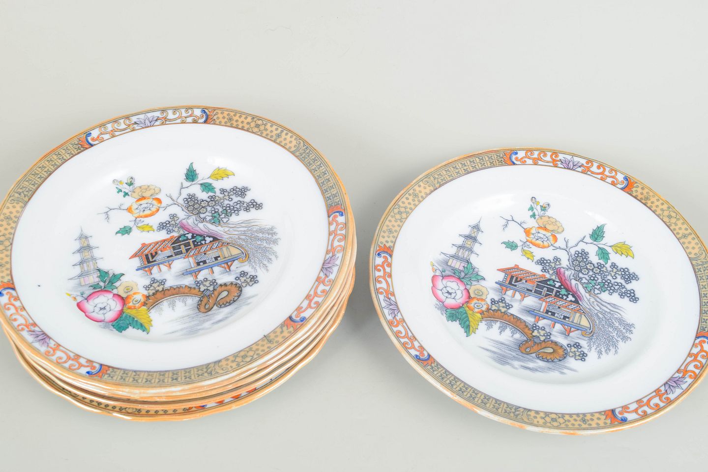 Middagstallerkener i fajance med orientalsk inspireret dekoration i polykrome farver og detaljerig bemaling i japansk stil, karakteristisk for Rörstrands japanismeproduktion fra begyndelsen af 1900-tallet.