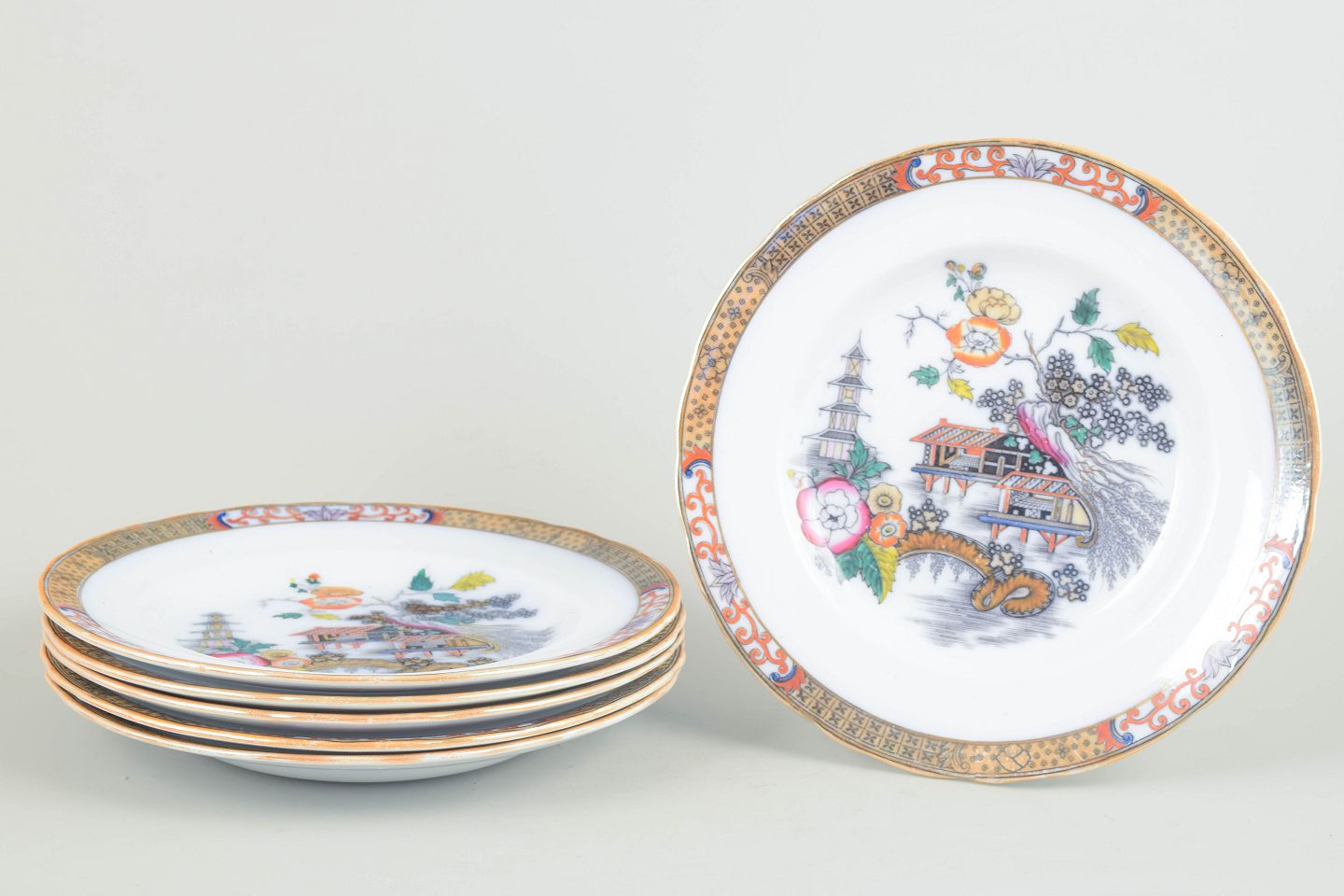 Middagstallerkener i fajance med orientalsk inspireret dekoration i polykrome farver og detaljerig bemaling i japansk stil, karakteristisk for Rörstrands japanismeproduktion fra begyndelsen af 1900-tallet.