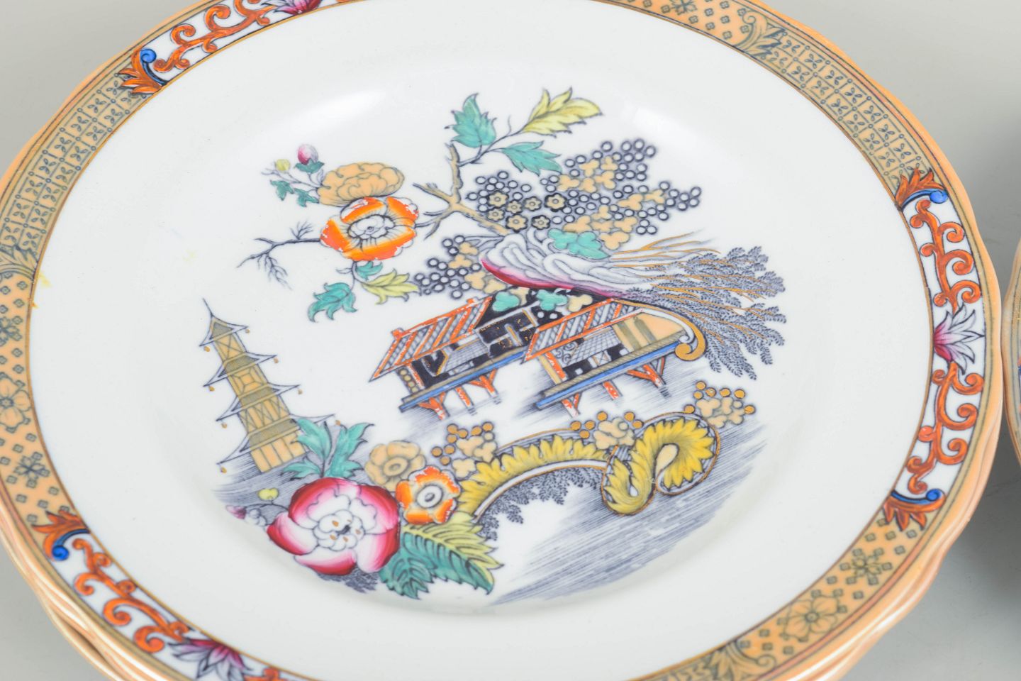 Middagstallerkener i fajance med orientalsk inspireret dekoration i polykrome farver og detaljerig bemaling i japansk stil, karakteristisk for Rörstrands japanismeproduktion fra begyndelsen af 1900-tallet.
