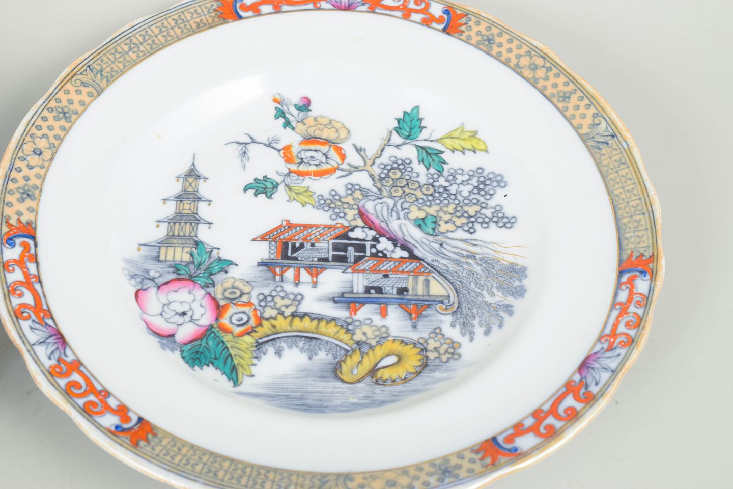 Middagstallerkener i fajance med orientalsk inspireret dekoration i polykrome farver og detaljerig bemaling i japansk stil, karakteristisk for Rörstrands japanismeproduktion fra begyndelsen af 1900-tallet.